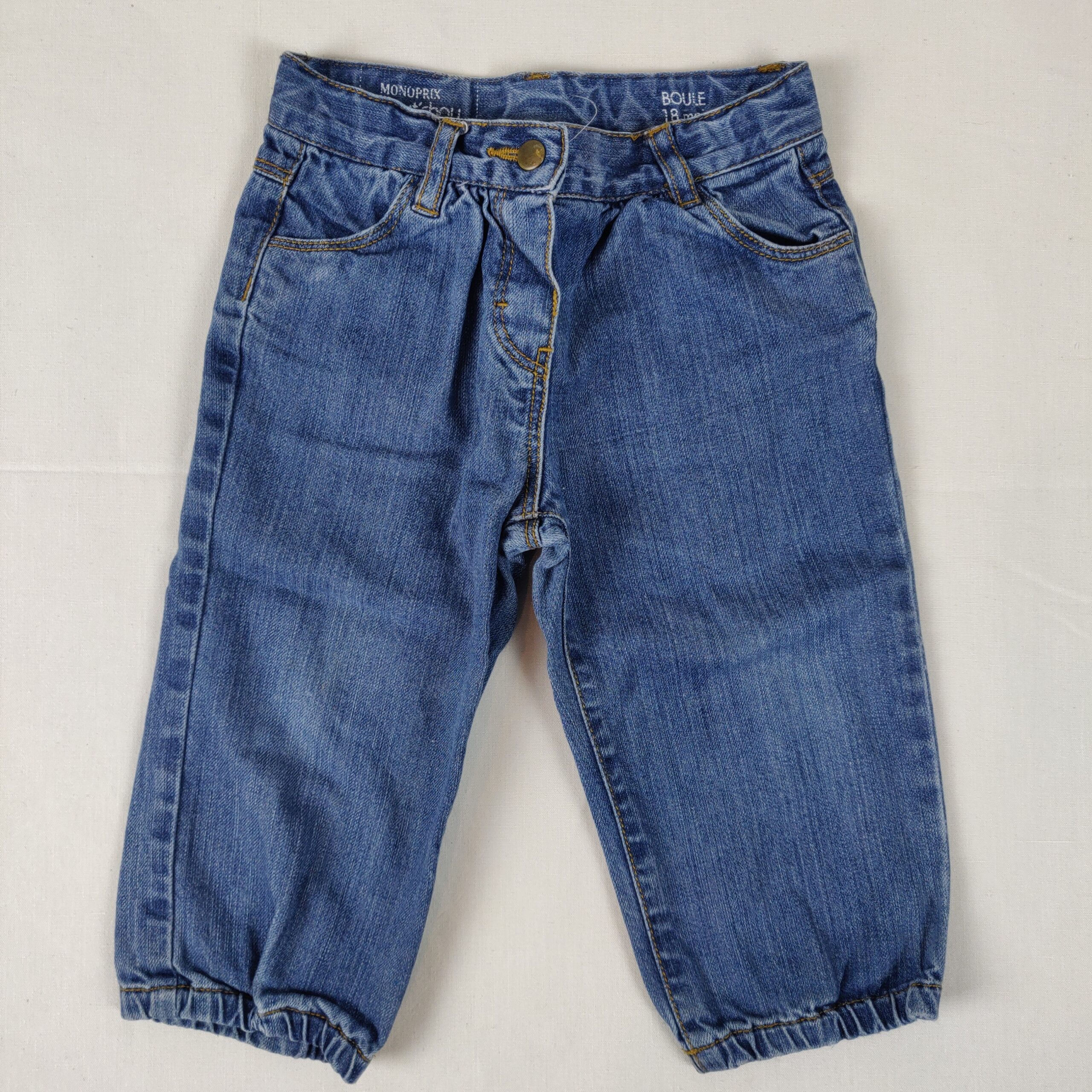 Autres commentaires : Jean bleu denim, fronces à la taille, chevilles élastiquées, taille ajustable. Petit défaut : accroc rappiécé au niveau du revers de la fermeture, assez discret pour lui donner une vie de plus.