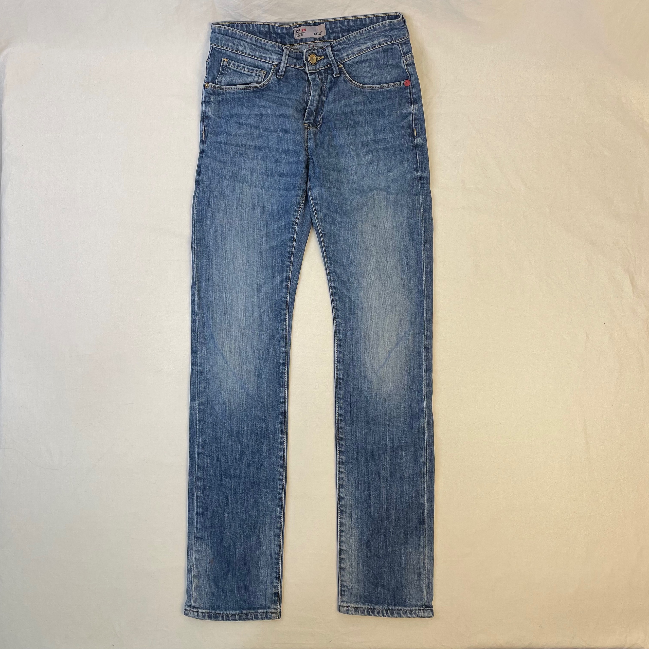 - Jeans droit en denim, 5 poches, passants pour ceinture, fermeture par zip et par bouton pression, effet use, taille 28 (36 cm).