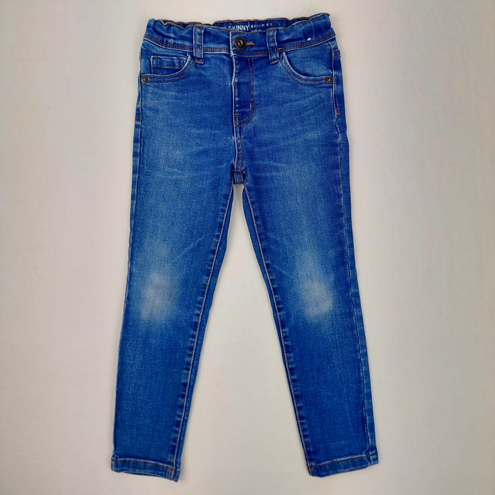 Autres commentaires : 21% Polyester 3% viscose 1% élasthanne . Jean bleu skinny, Ceinture ajustable par élastique intérieur, fermeture par bouton.