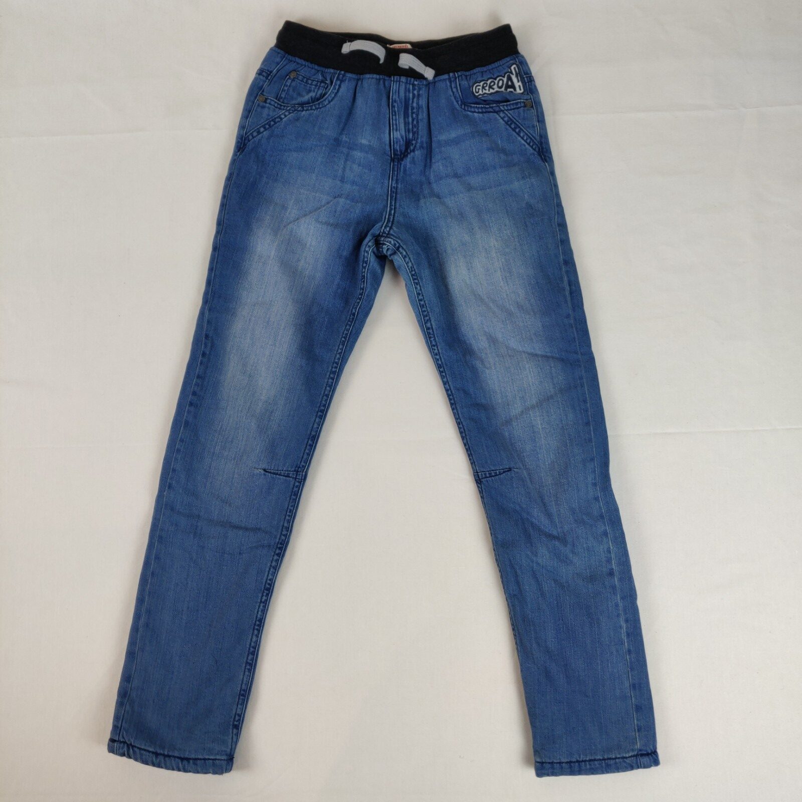 Autres commentaires : Jean doublé en polaire – bleu. Taille élastique avec cordon interne gris. 2 poches latérales dont celle de droite surmontée de l’inscription cousue « Grrroa! ». 2 poches arrières dont celle de droite ornée d’une dinosaure rouge cousu. Marques d’usure au niveau des jambes.