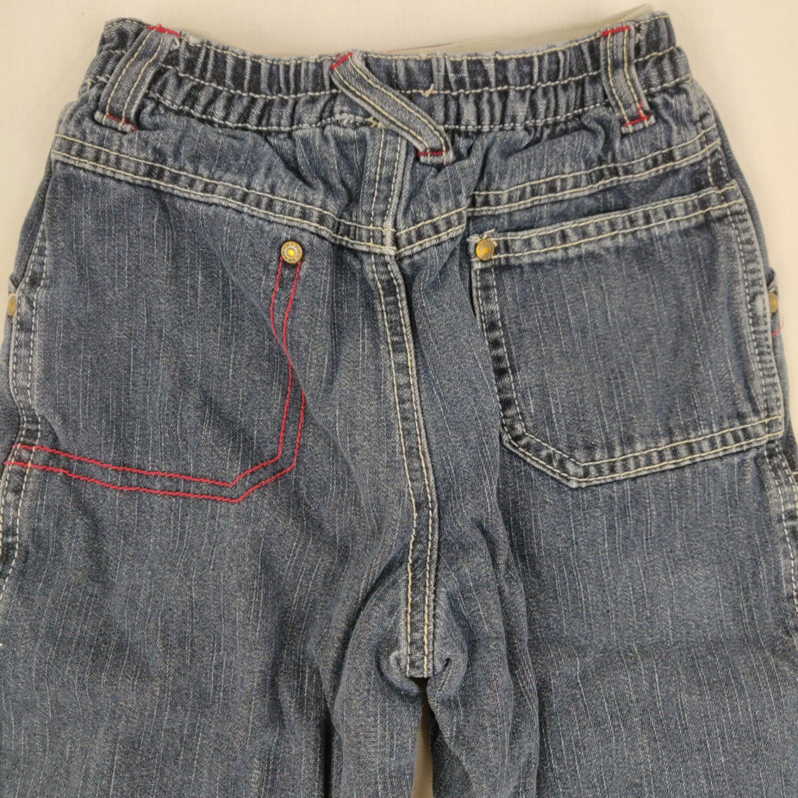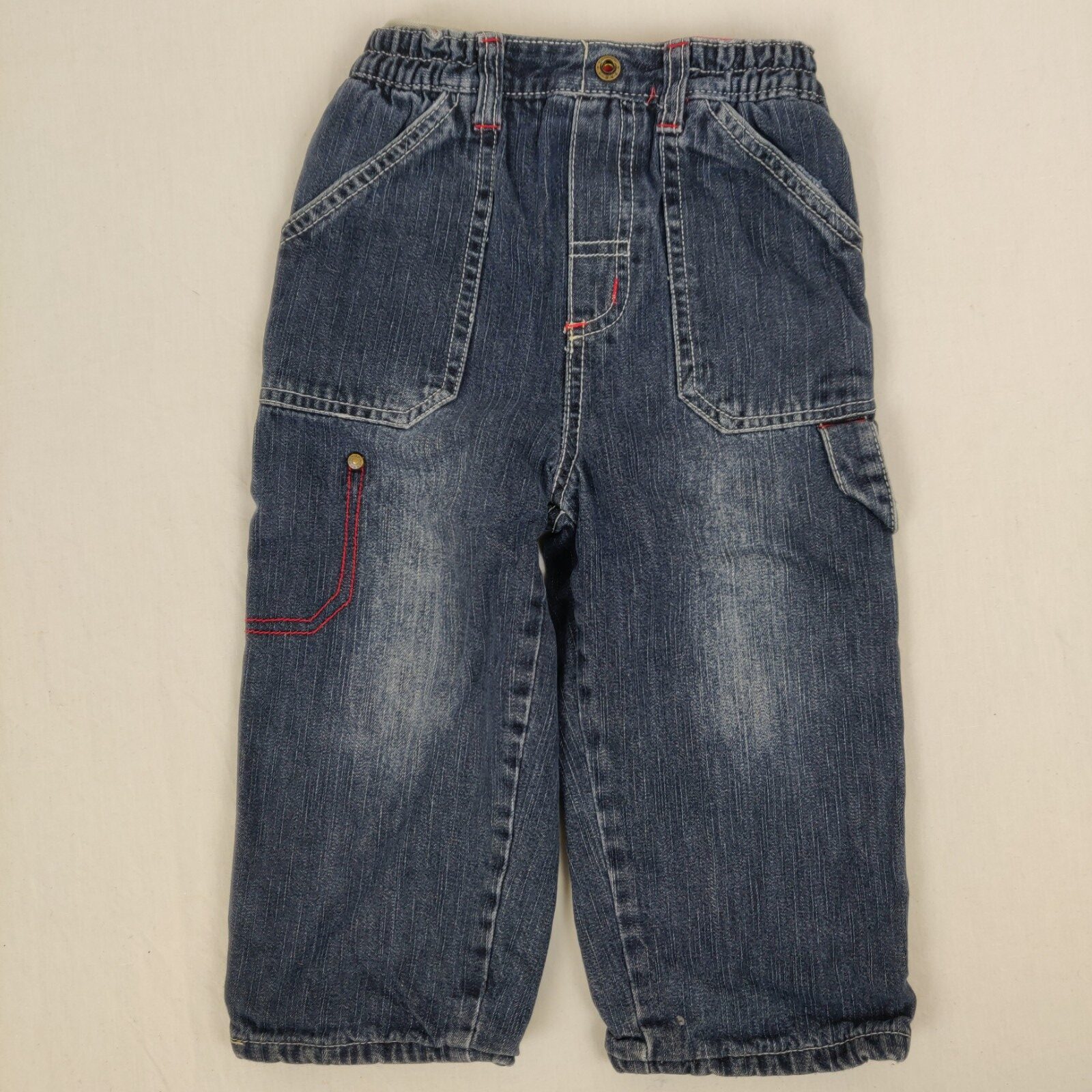 Autres commentaires : Jean bleu foncé doublé avec taille élastiquée et 2 poches latérales.