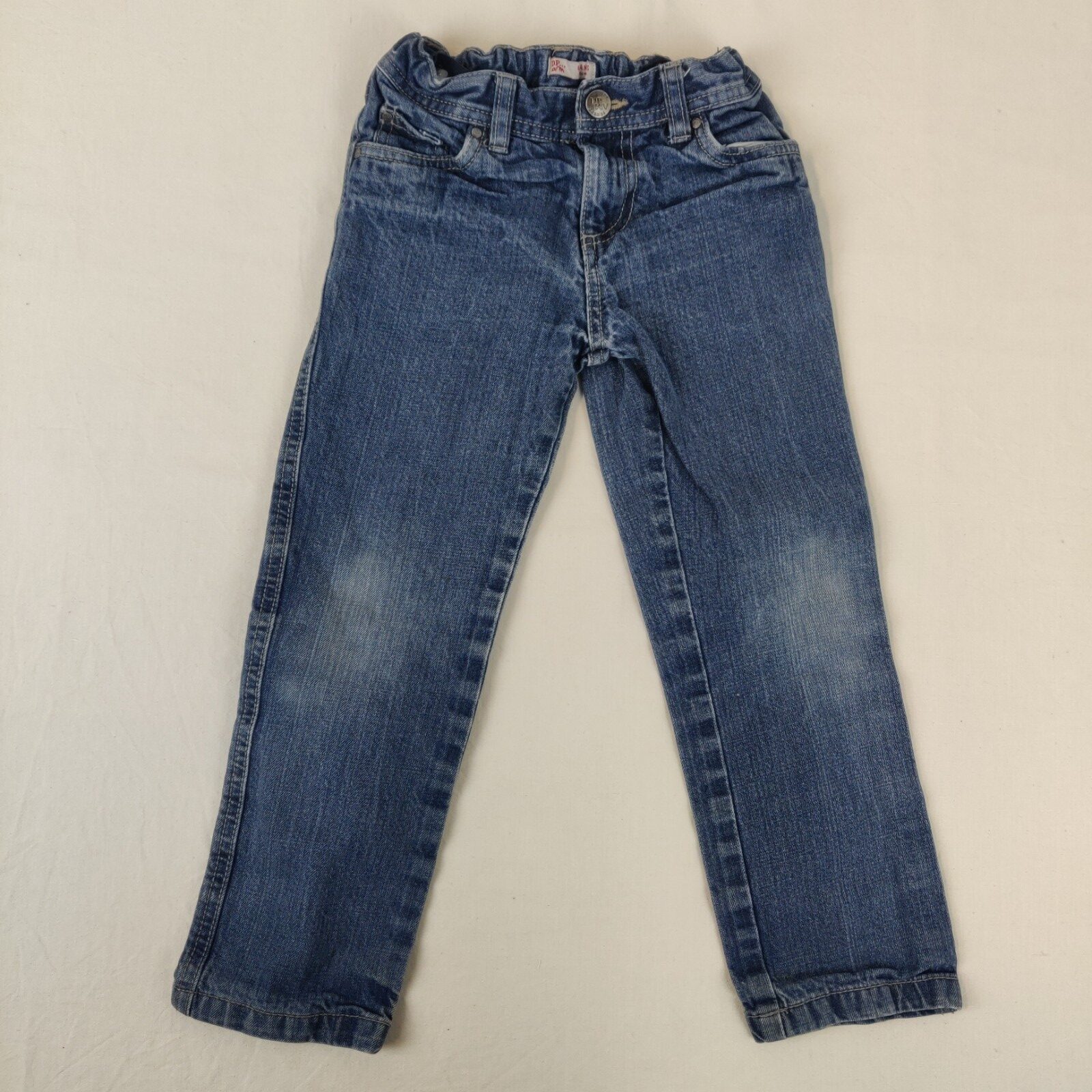 Autres commentaires : Jean en denim bleu. Taille ajustable. 2 poches latérales et 2 poches arrières. Passants pour une ceinture. Légères marques d’usure au niveau des jambes.