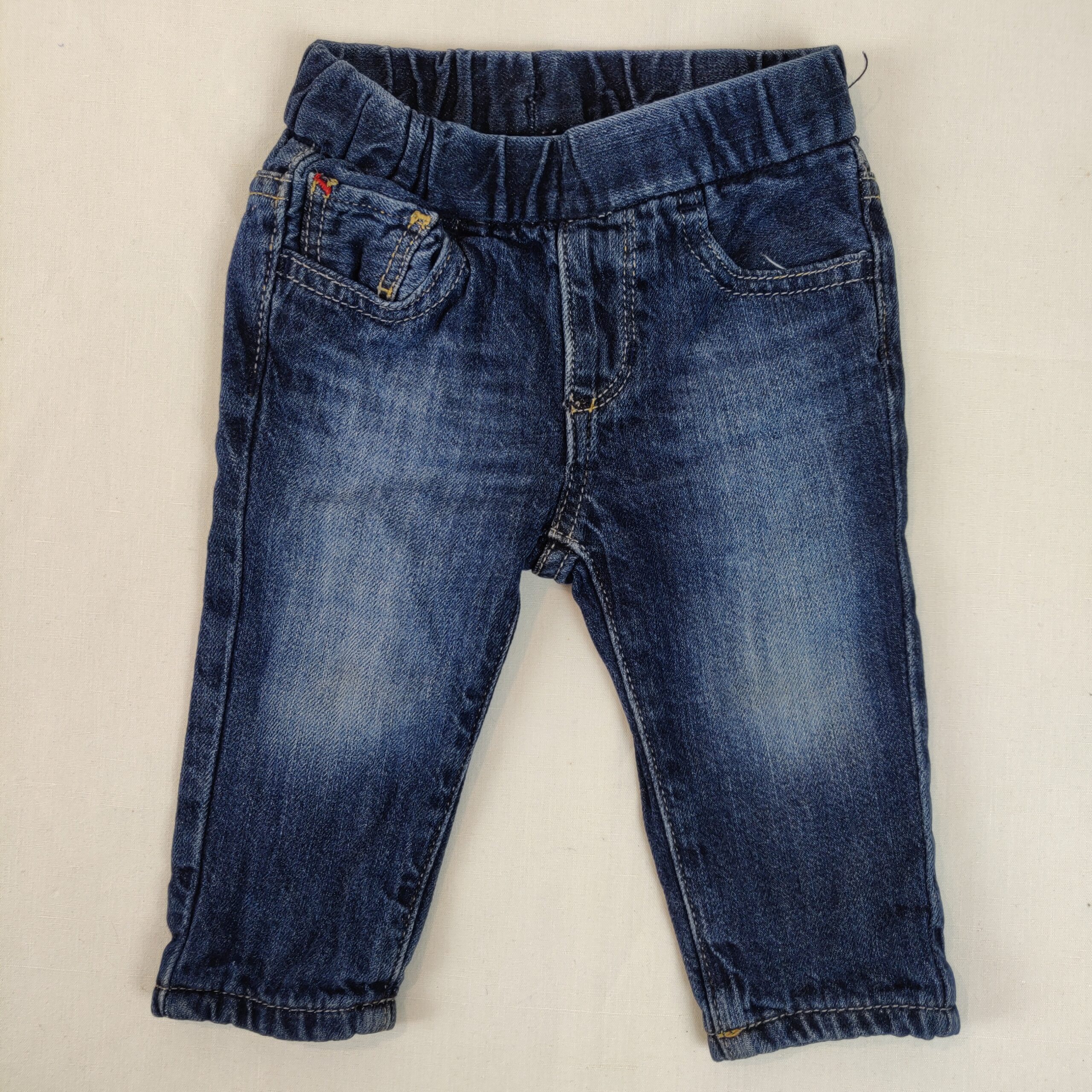 Autres commentaires : Jean – bleu foncé avec doublure tissu « bucheron » noir et rouge – taille élastique. 2 poches latérales et 2 poches arrières.