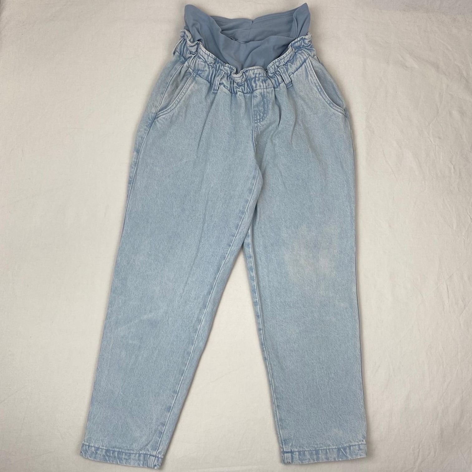 Autres commentaires : Jean maternité bleu très clair, style bootcamp, élastiqué et froncé à la taille avec ceinture-bandeau bleu en tissu 97% coton et 3% élasthanne pour plus de confort. Taille S mais très large.