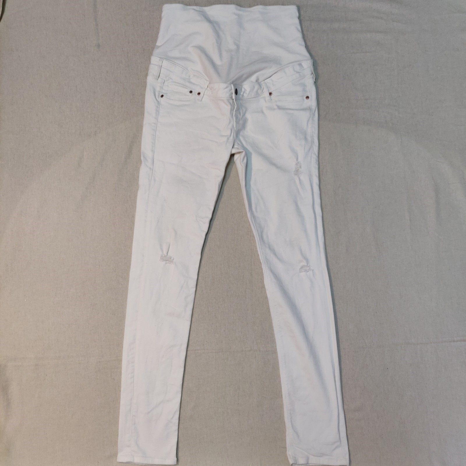 Autres commentaires : 6% Elasthanne. Jean denim blanc effet taille basse avec ceinture large confortable. Fausses poches devant et vraies poches dans le dos. Modèle Skinny. Détails fortement usés pour effet mode.