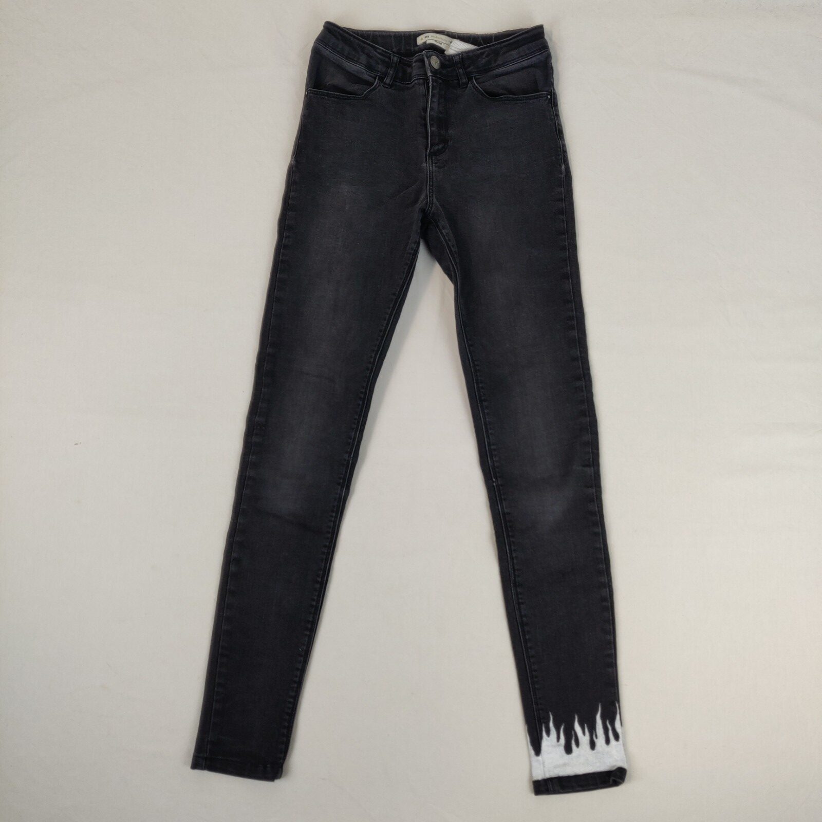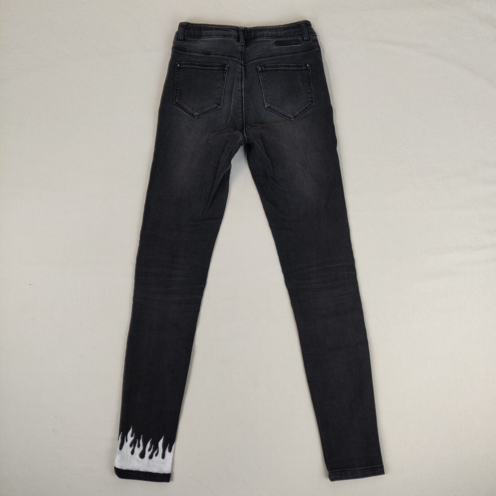 Autres commentaires : Collection « We are young » Jeans skinny noir taille 24 avec 2 poches devant et dérrières. En illustratration un dessin d’une flamme blanche au niveau d’en bas des jambes Contient 70% de coton,28% de Polyester et 2% d’elasthanne.
