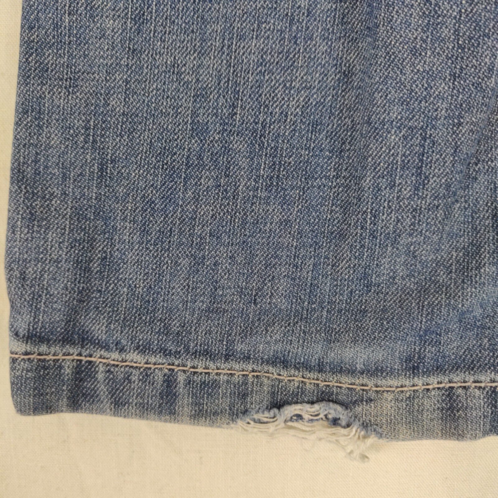 Autres commentaires : Jean en denim bleu – taille ajustable. Coutures roses apparentes. 2 poches latérales et 2 poches arrières dont une ornée d’un noeud rose brodé. Marques d’usure au niveau des jambes et chevilles éfilochées. Niveau réduit de fraise à myrtille.