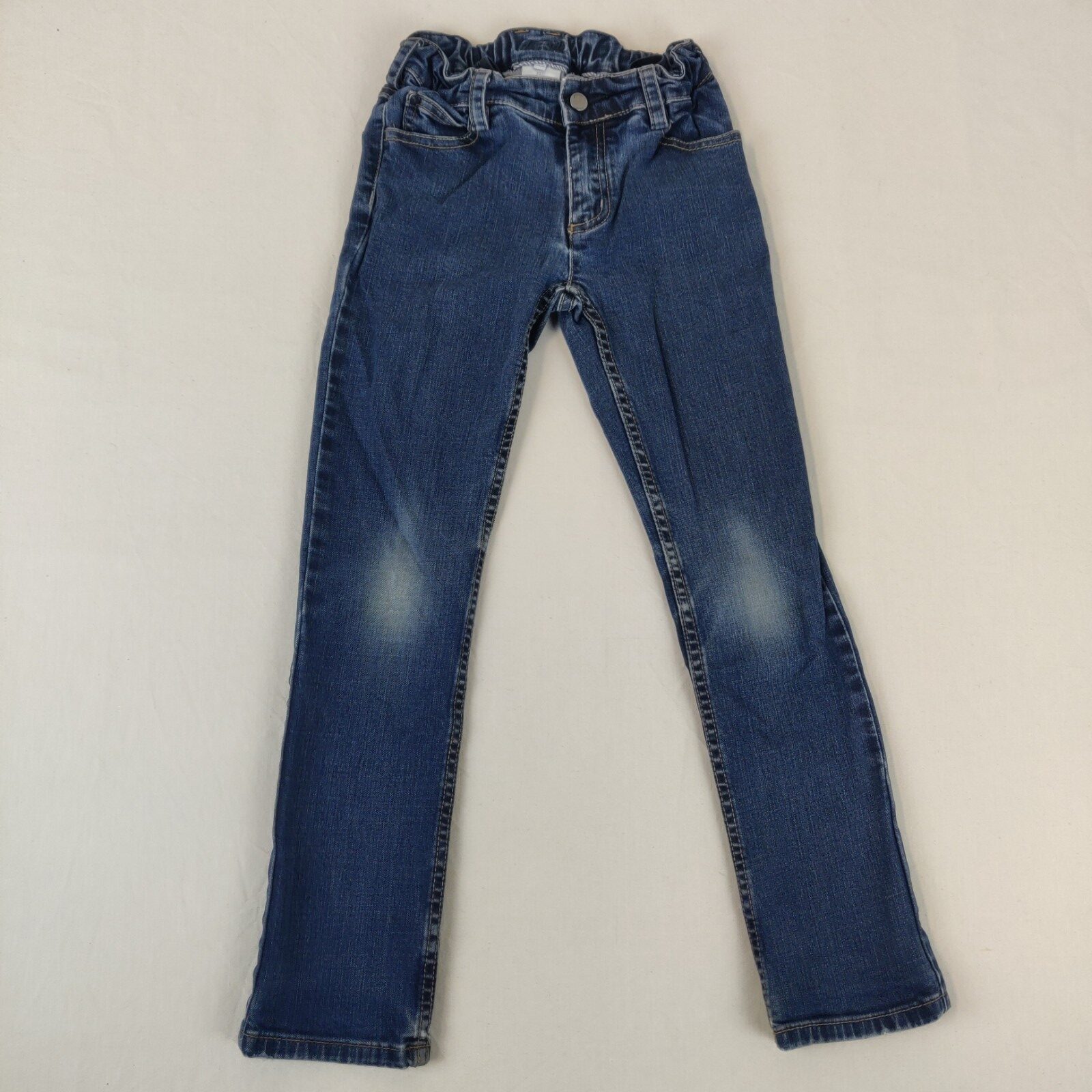 Autres commentaires : 1% élasthanne. Jean en denim bleu brut. Taille ajustable et élastique. 2 poches latérales et 2 poches arrières. Passants pour une ceinture. Marques d’usure au niveau des jambes.