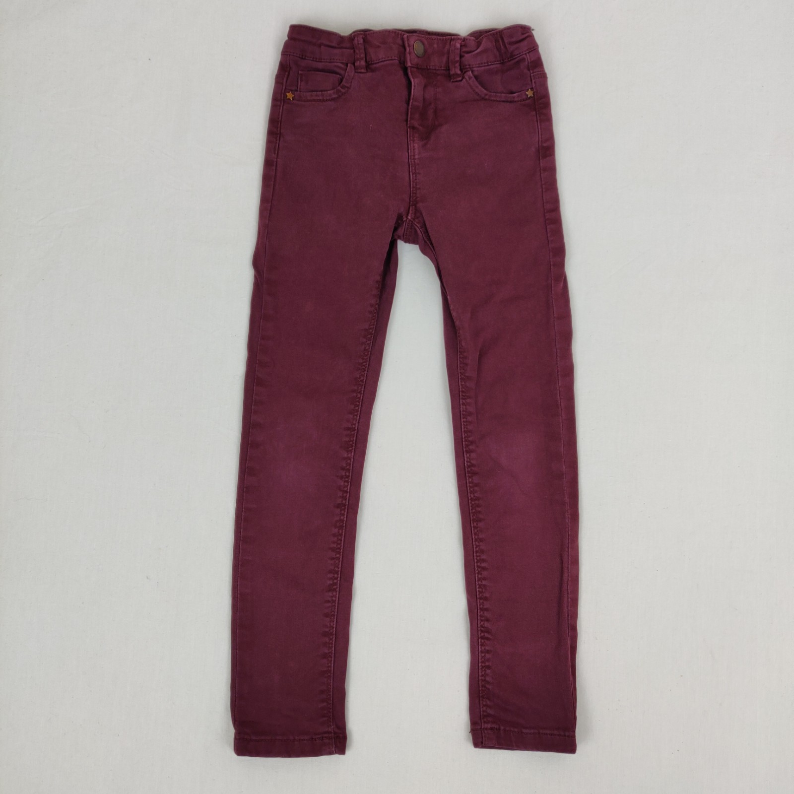 Autres commentaires : Jean skinny bordeaux avec taille élastiquée et ceinturée.