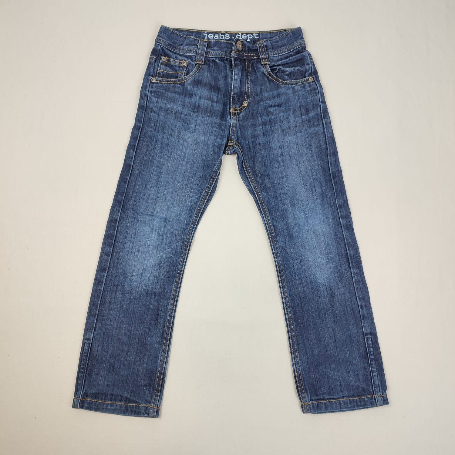 Autres commentaires : Jean bleu, ceinture ajustable par élastique intérieur, fermeture par crochet et zip.