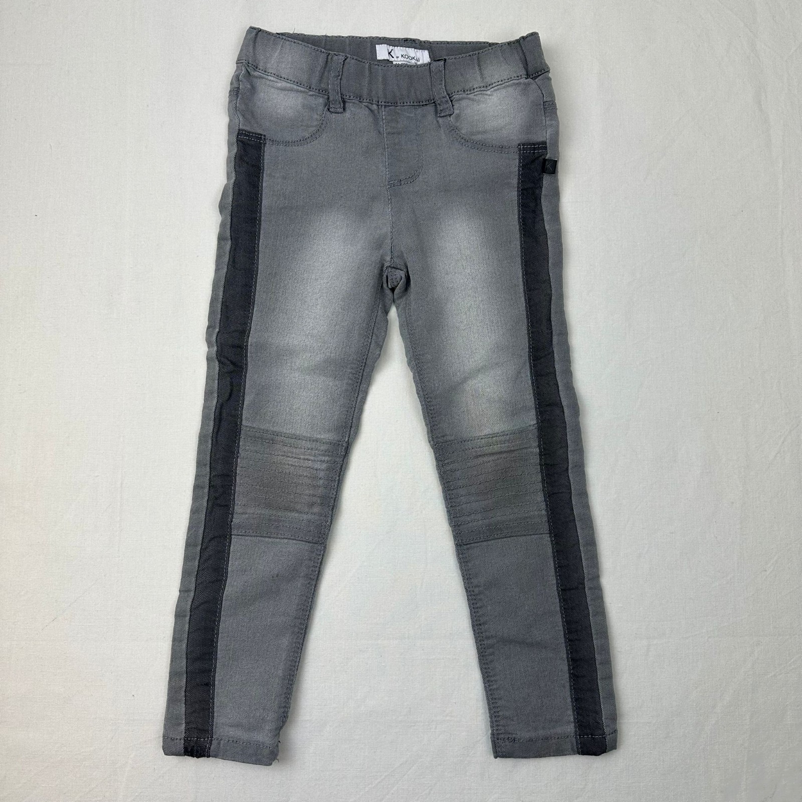 Autres commentaires : Jegging gris avec avec bande gris foncé à l’éxtrémité et taille élastiquée.