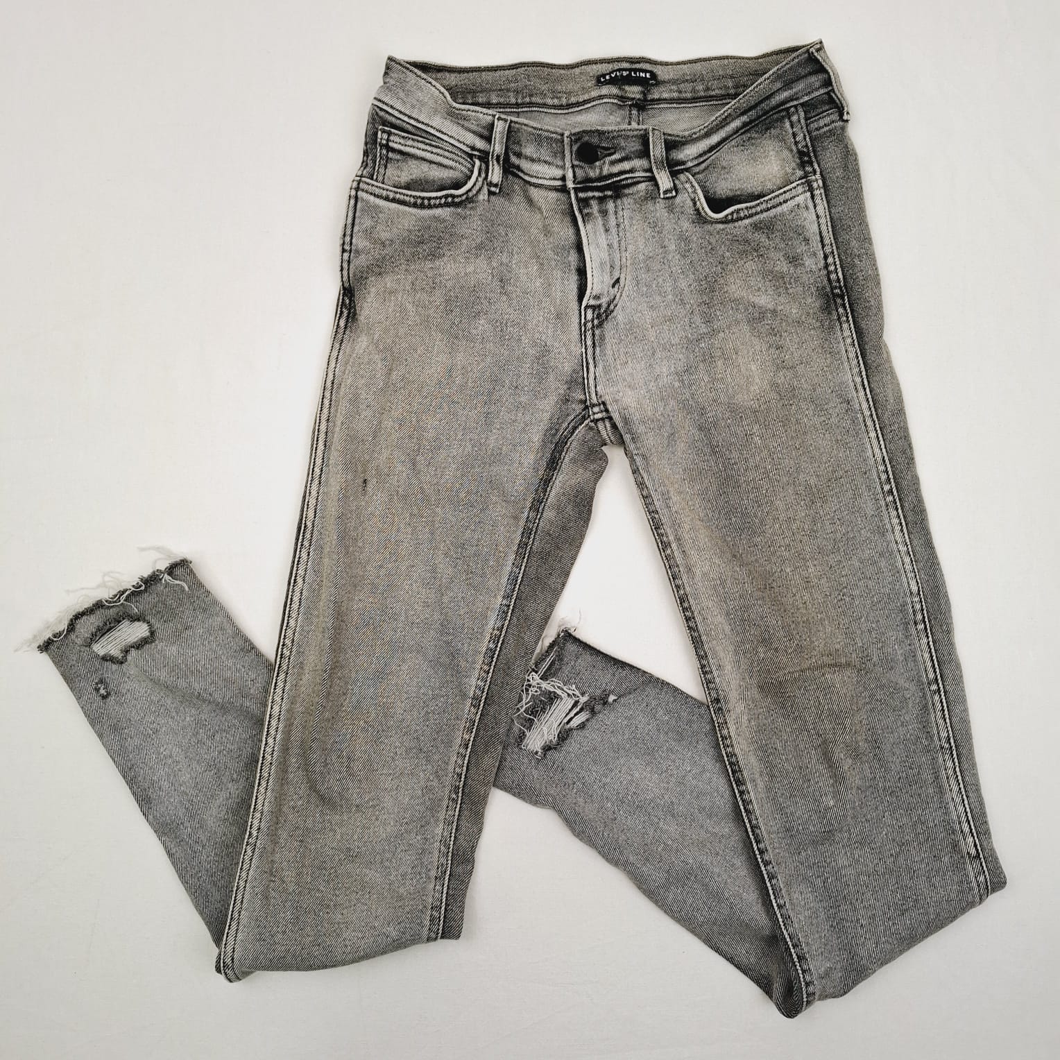 Autres commentaires : 4% polyester, 1% élasthanne. Jeans gris, fermeture par bouton et zip.