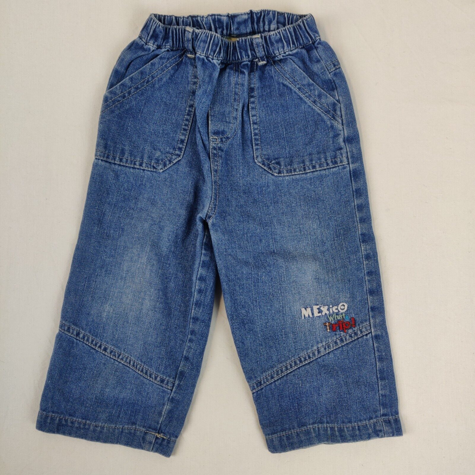 Autres commentaires : Jean en denim bleu. Taille élastique. 2 poches latérales. Inscription au bas de la jambe gauche cousue « Mexico What a trip! ». Marques d’usure au niveau des jambes.