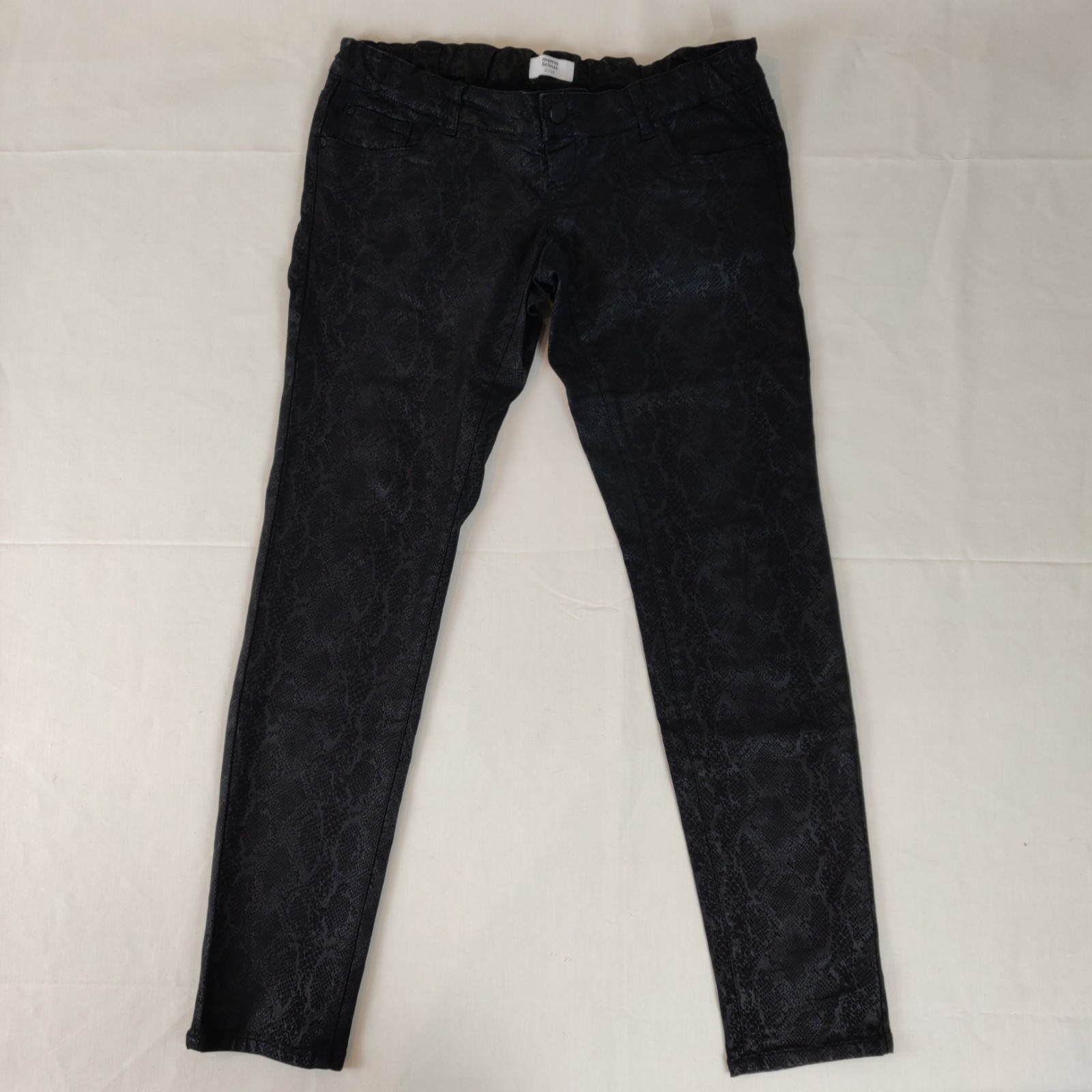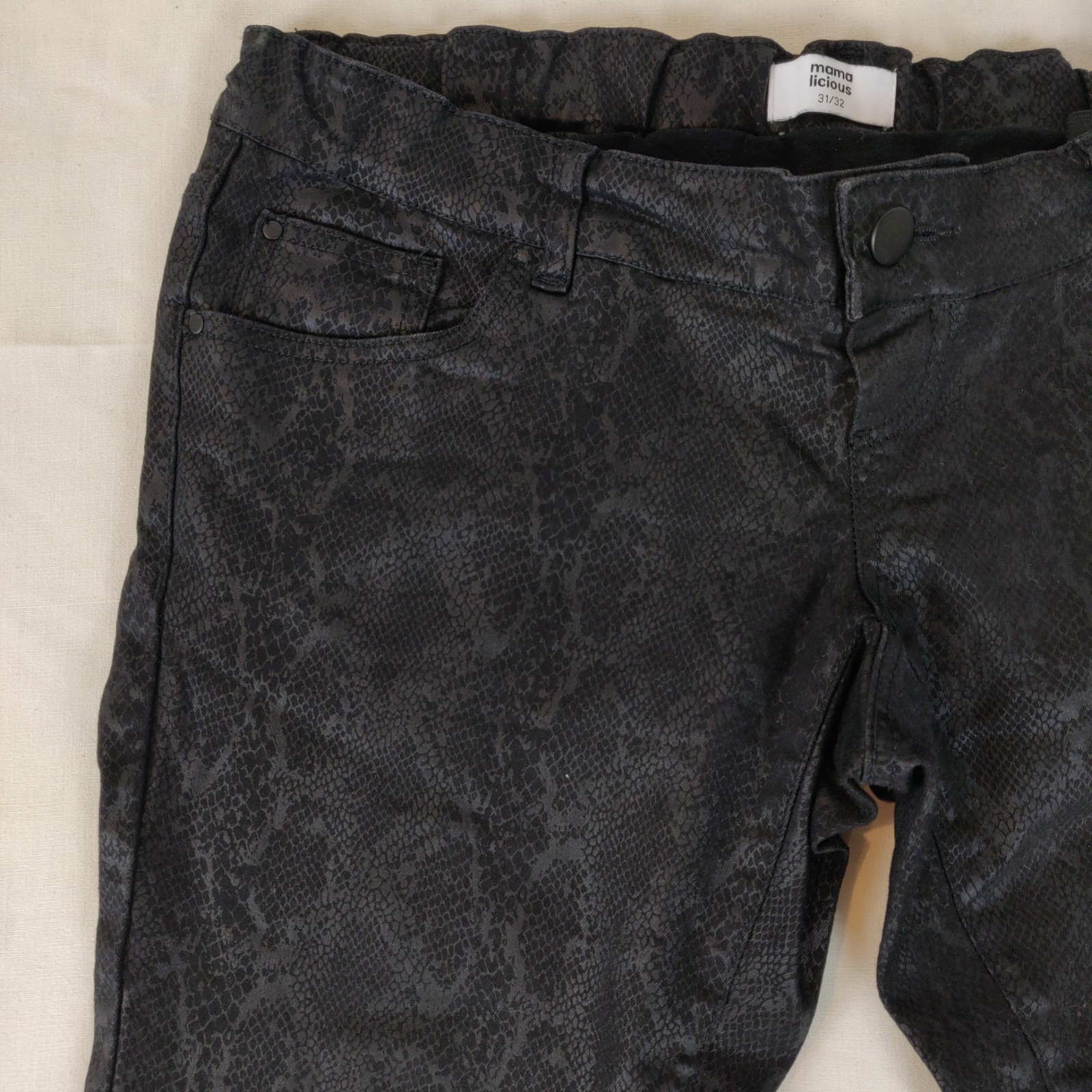 Autres commentaires : 28% Polyester, 22% viscose, 2% Élasthanne. Jean de grossesse enduit, taille 31/32. Bandeau pour le ventre en coton, taille élastique pour un ajustement parfait.