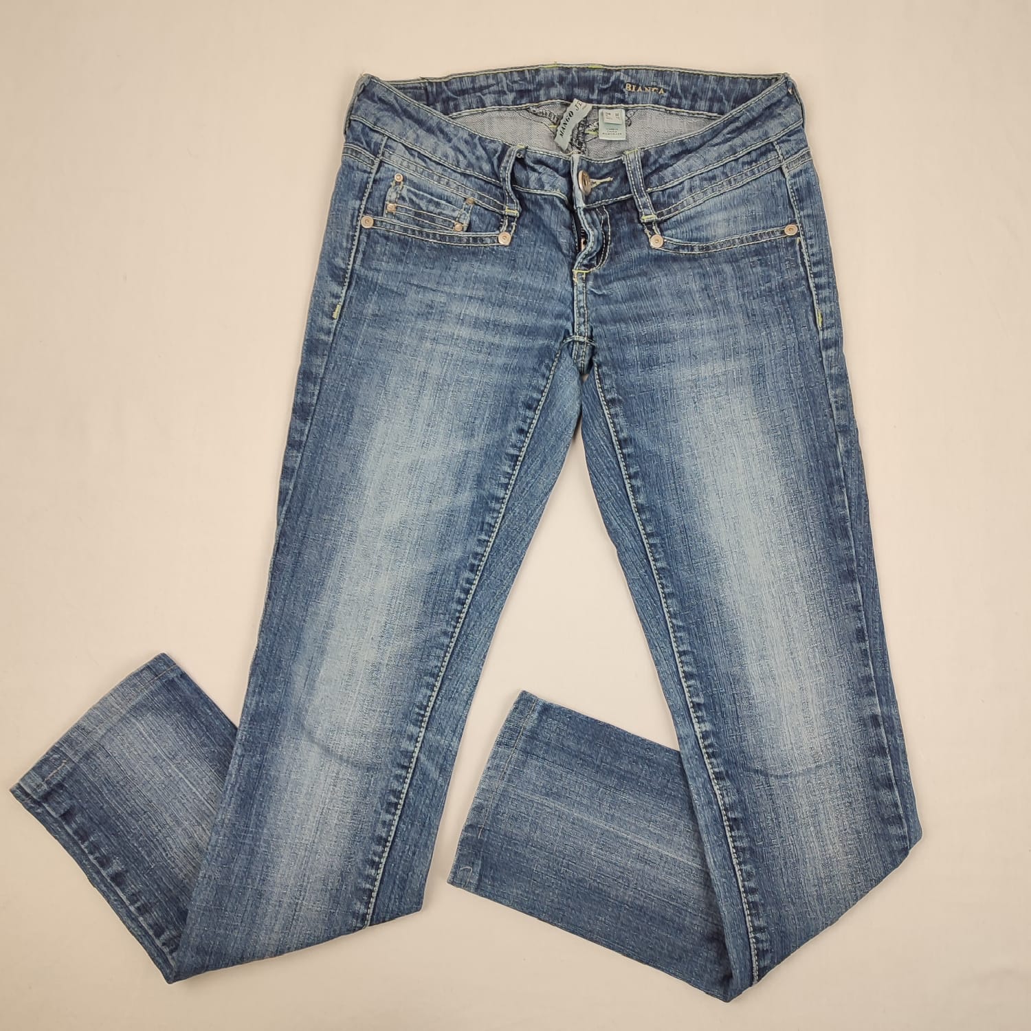 Autres commentaires : 2% élasthanne, Jeans bleu Mango, ceinture élastiquée, fermeture devant par bouton et zip.