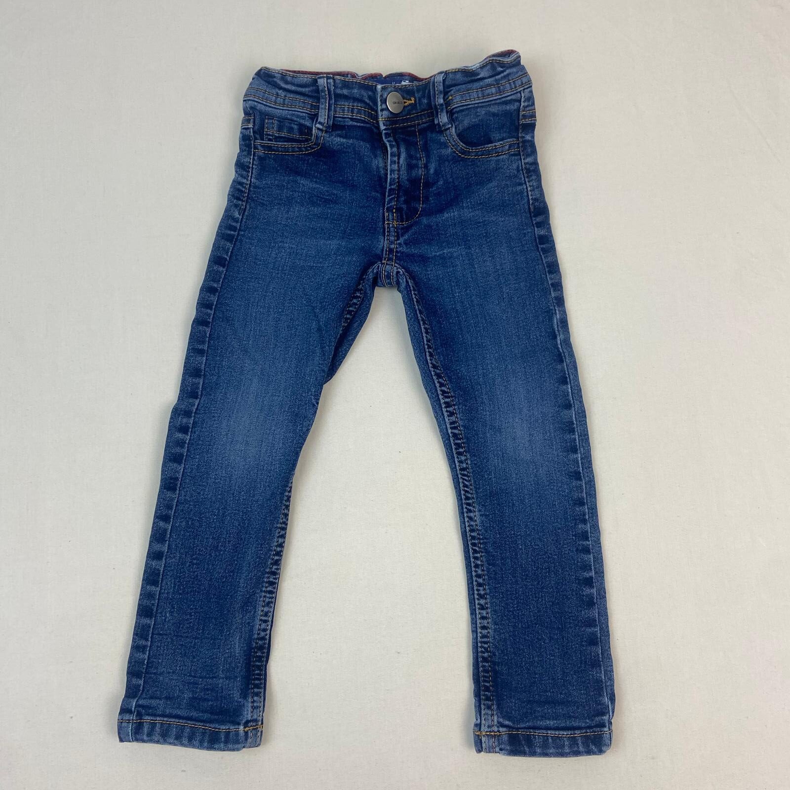Autres commentaires : Jeans bleu slim, ceinture ajustable par élastique intérieur, fermeture par bouton pression et zip.