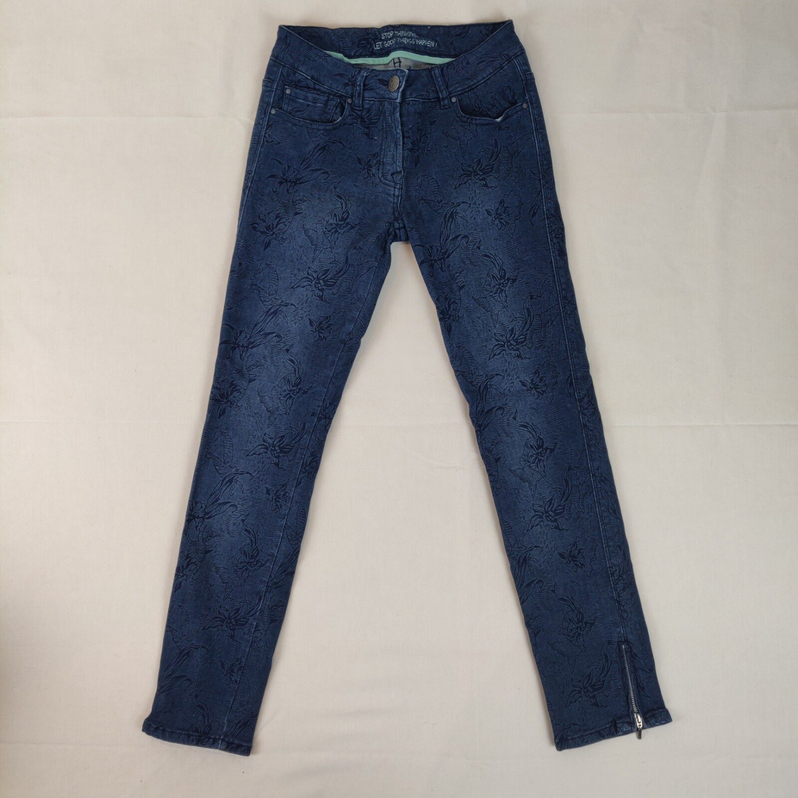 Autres commentaires : Jean sans étiquette, taille estimée 12 ans, format corsaire, bleu avec fleurs sérigraphiées. Ouverture cheville à fermeture éclair. 2 poches latérales et 2 poches arrières. Passants pour une ceinture.