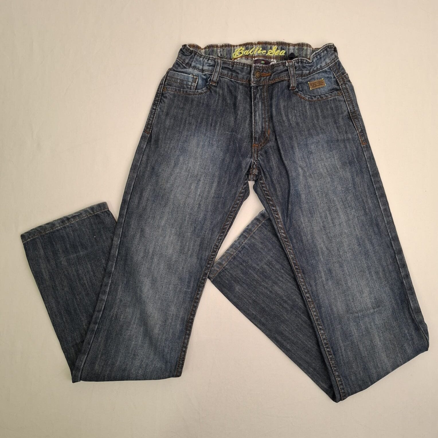 Autres commentaires : Jean droit bleu, fermeture devant par zip et crochet métallique, ceinture ajustable par élastique intérieur, collection Baltic Sea.