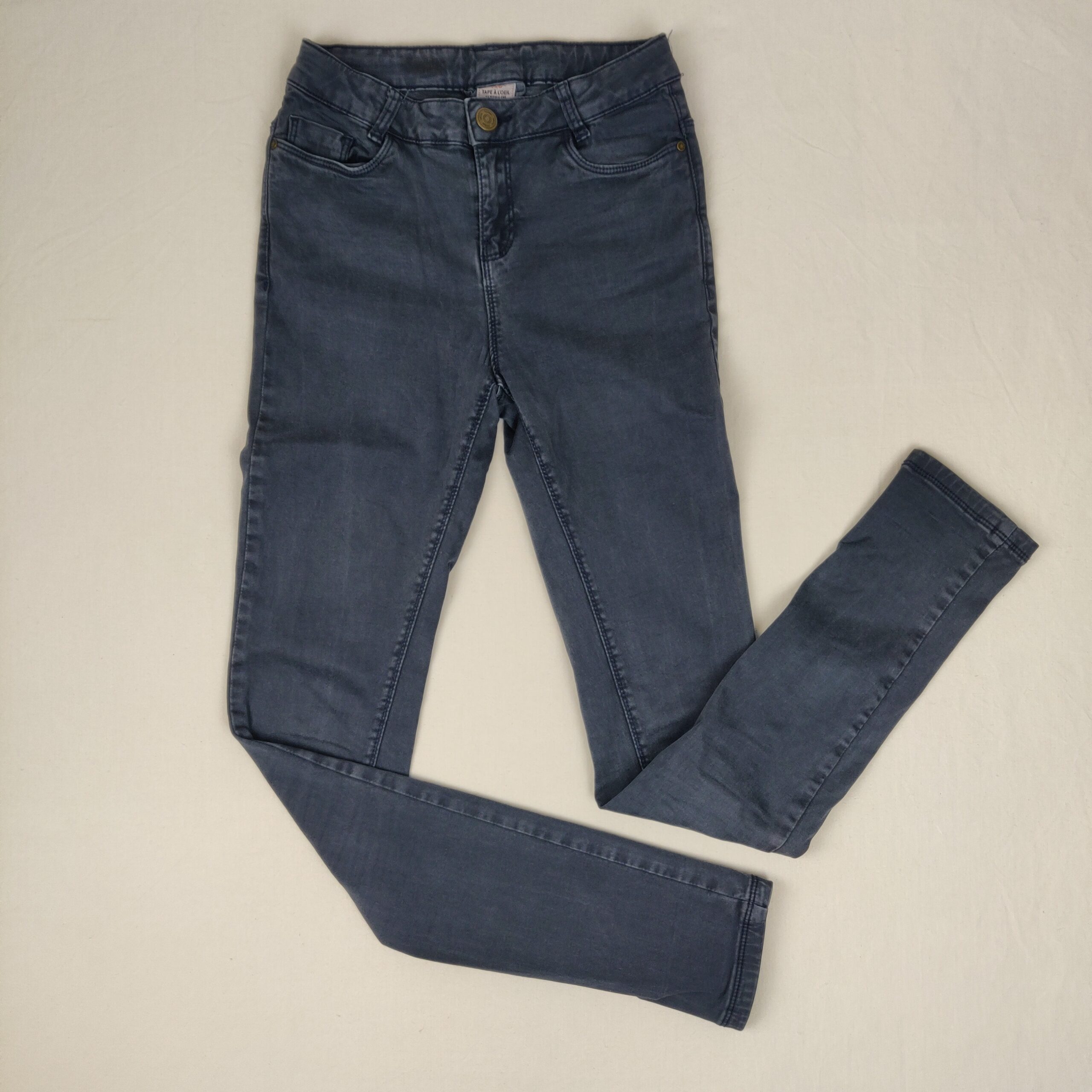 Autres commentaires : Pantalon style jeans gris ardoise, souple et légèrement satiné, taille ajustable.