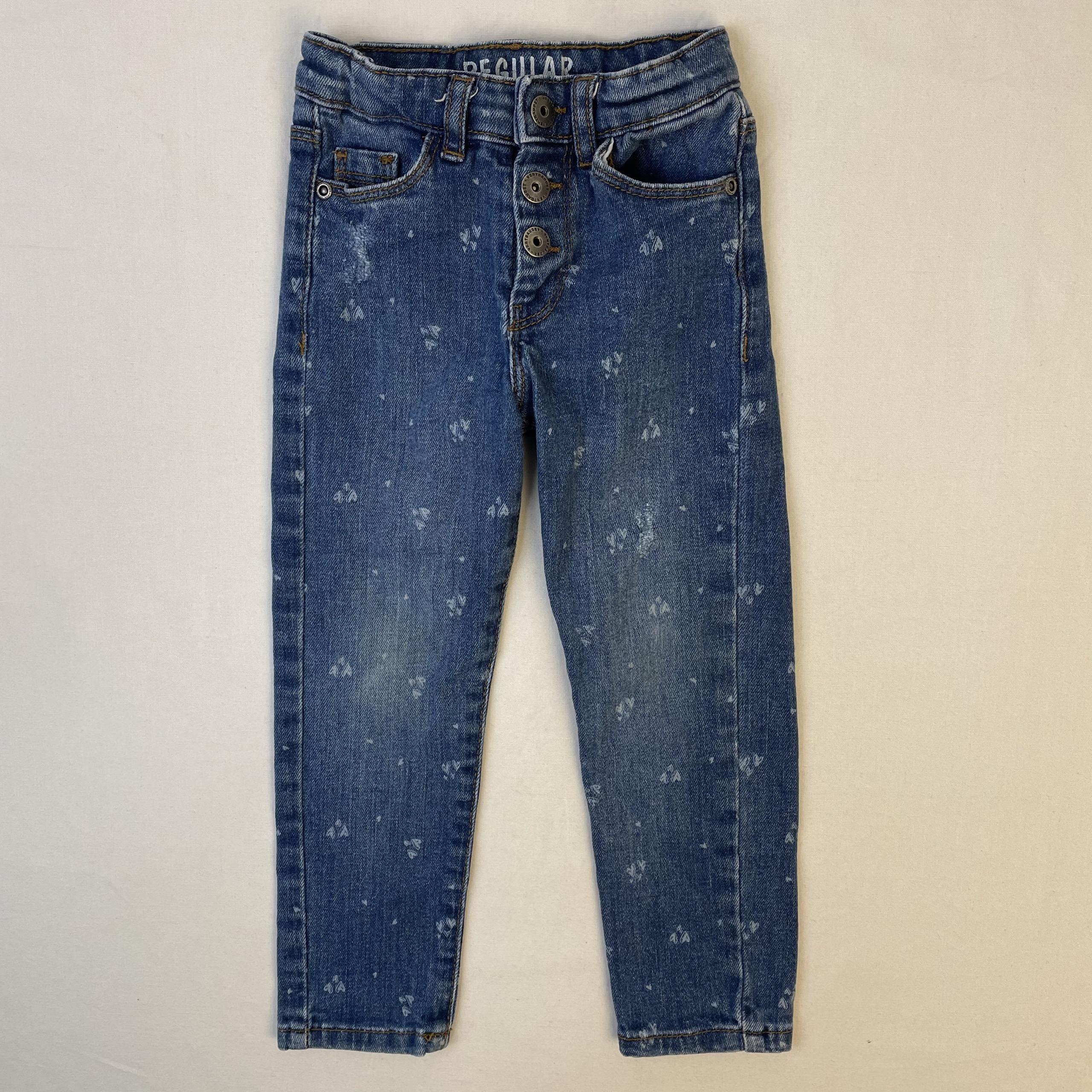 - Jean bleu coupe droite à motif cœur et effet, ceinture ajustable par élastique intérieur, fermeture par boutons pressions
