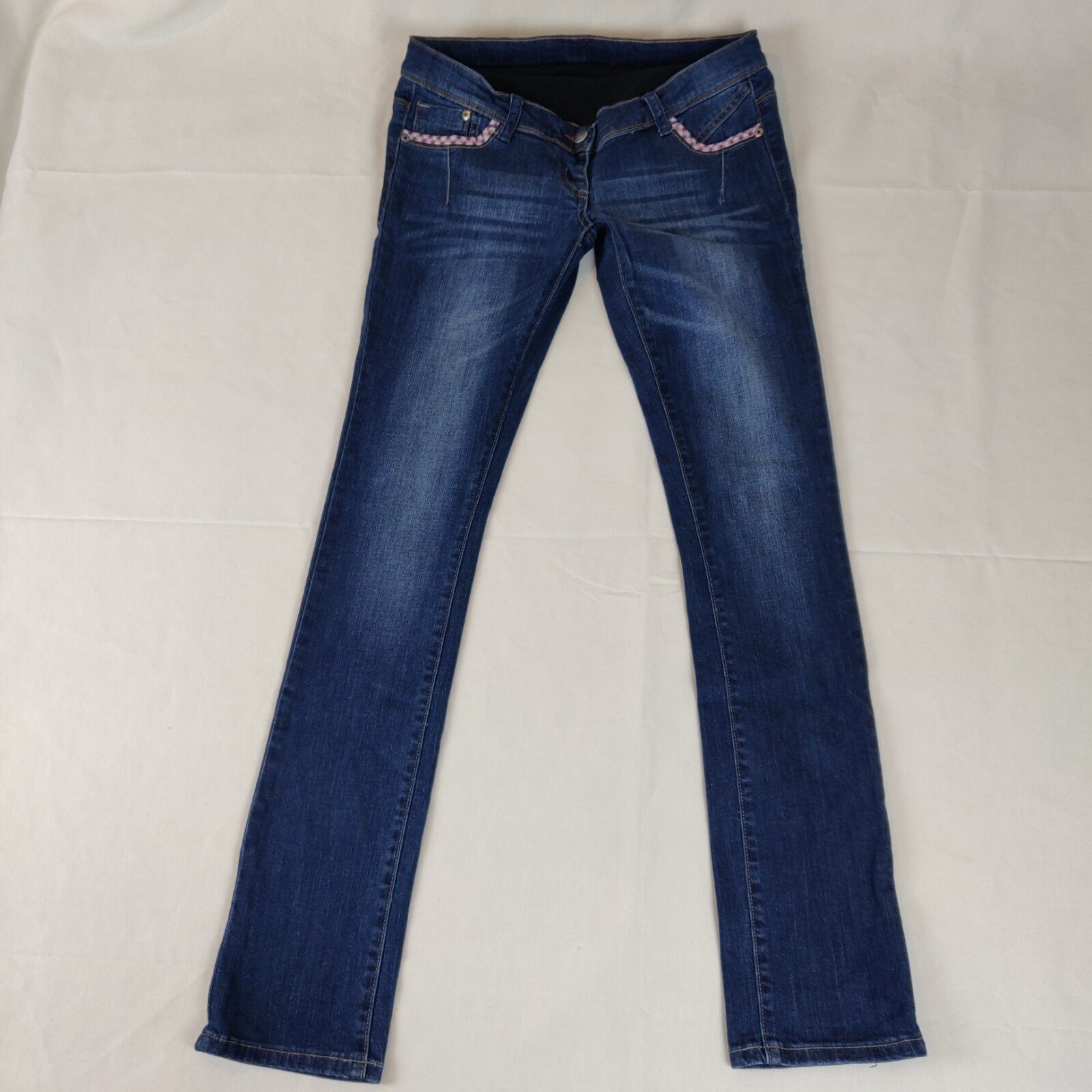 Autres commentaires : 1% Elasthanne. Jean denim skinny, effet used. poches décorées avec tissu blanc à carreaux bordeaux. 2 poches au dos. Badeau pour le maintien ventre élastiquée en haut.
