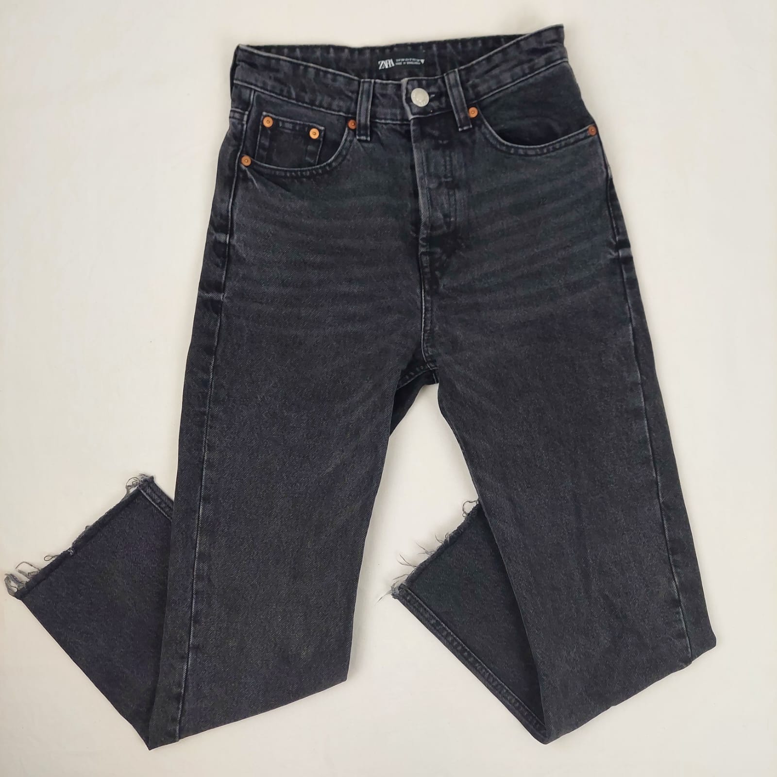 Autres commentaires : Jeans court taille haute noir délavé, taille 34, coupé à la cheville