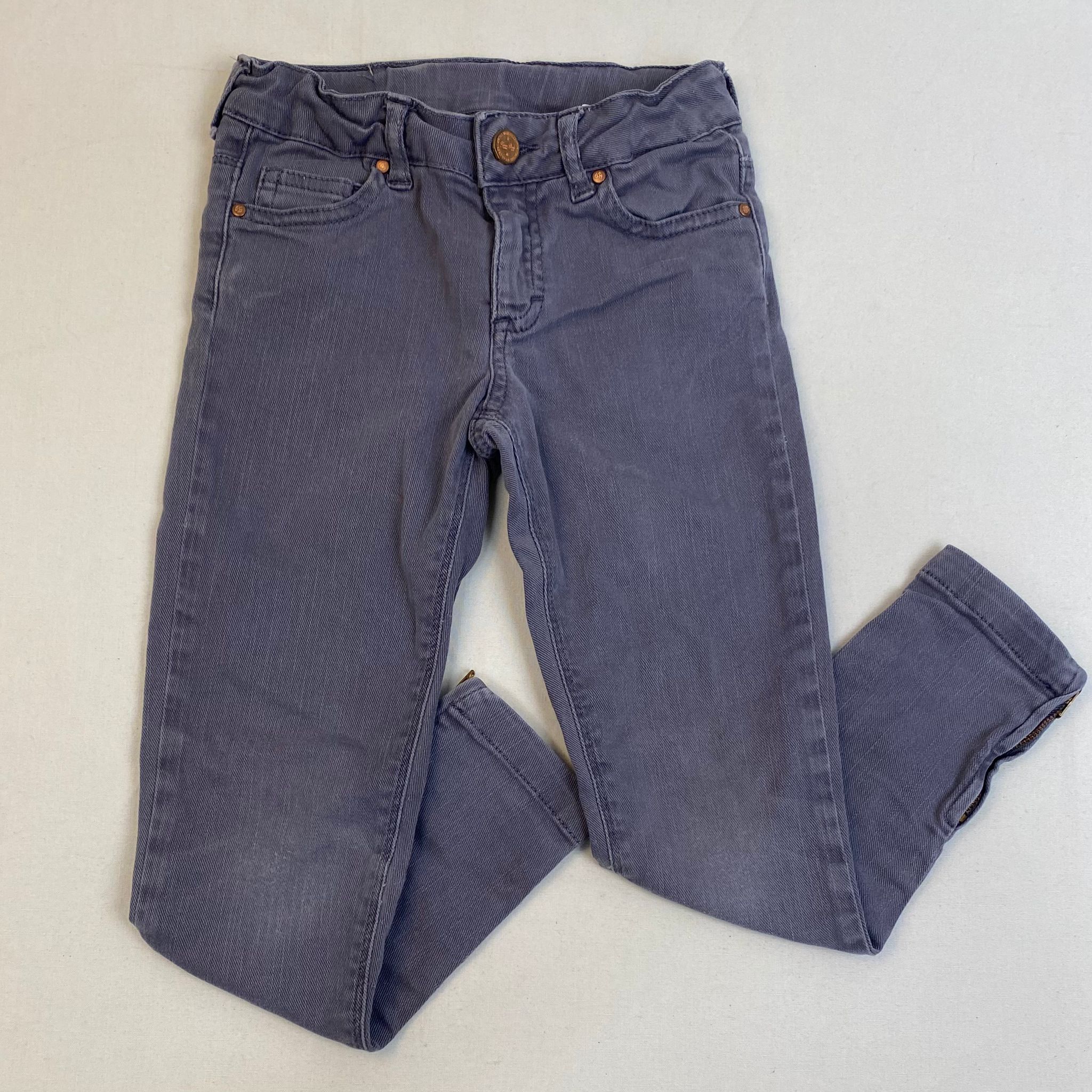 Jean gris skinny, ceinture ajustable par élastique intérieur, fermeture par bouton et zip. Petit défaut : petite tache sur la jambe gauche et légère usure des genoux, niveau réduit de fraise à myrtille