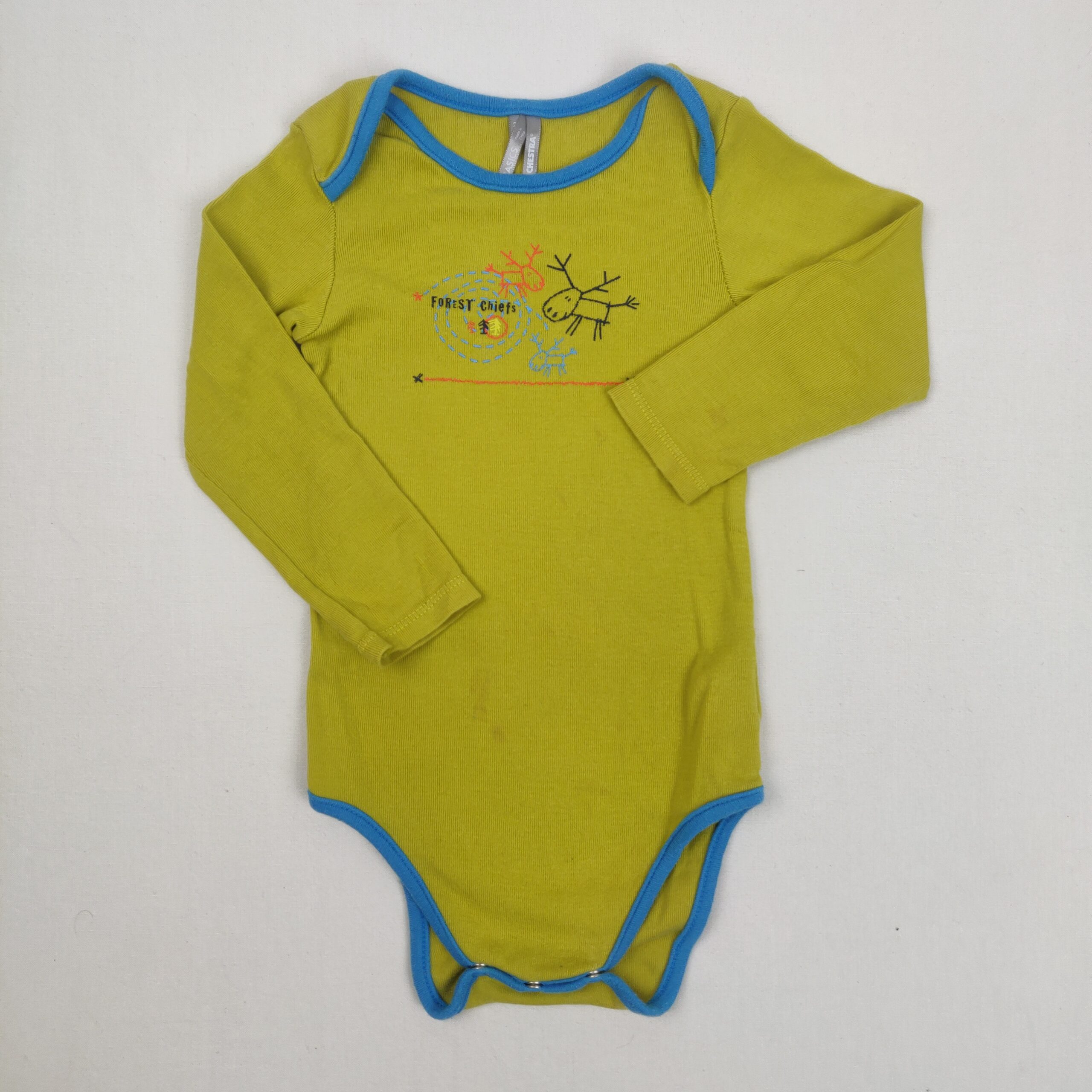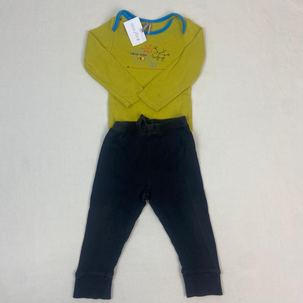 Autres commentaires : Paire de leggings noire unie en jersey de coton finement côtelée, taille élastique, avec body à manches longues Orchestra offert : couleur pistache avec bordure bleue, motif élan, inscription » forest chiefs ».