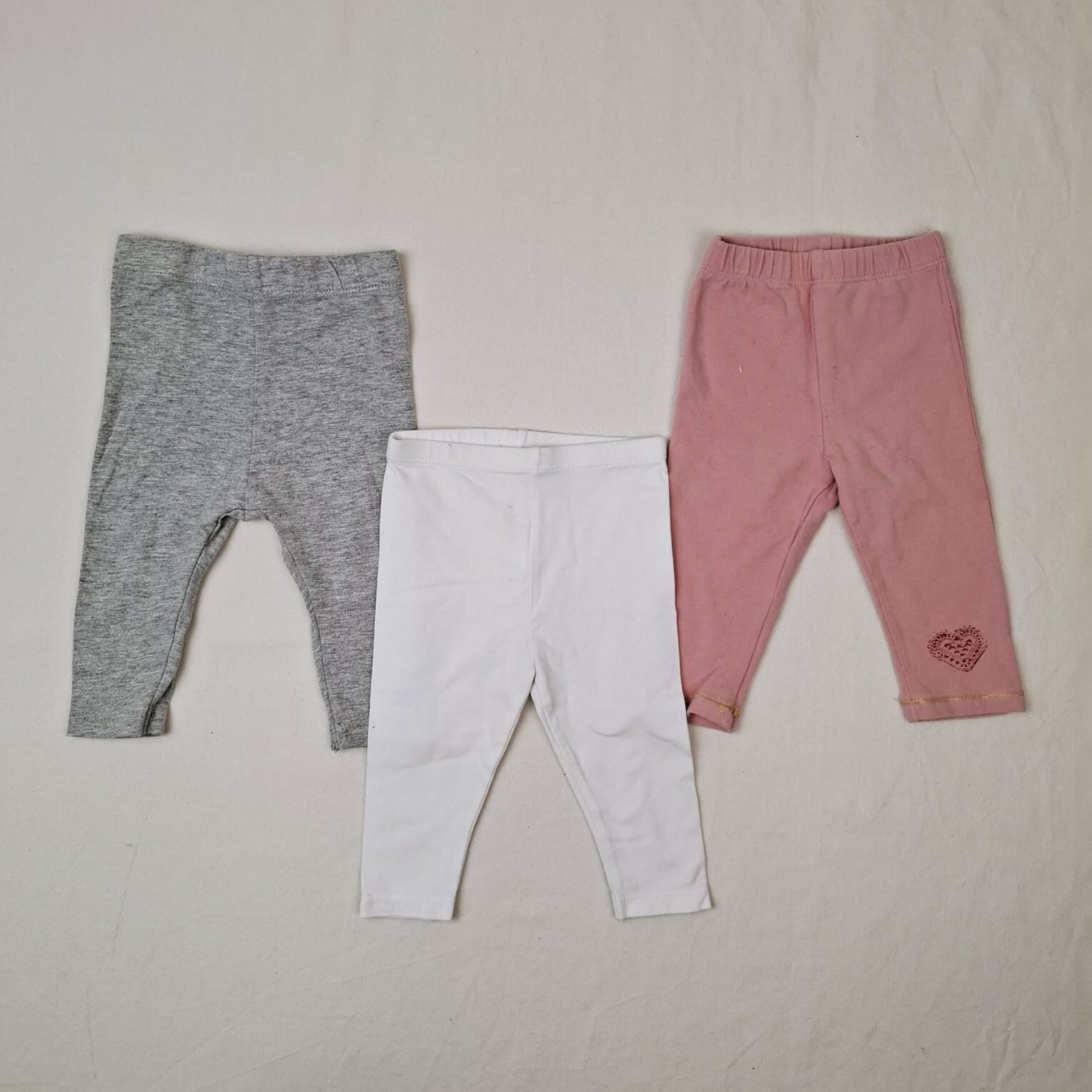 Autres commentaires : Lot de 3 leggings, taille élastique: -Rose uni Sucre d’orge. -Blanc uni OBAIBI. – Grise uni KIABI, 88% coton, 8% viscose, 4% élasthanne.