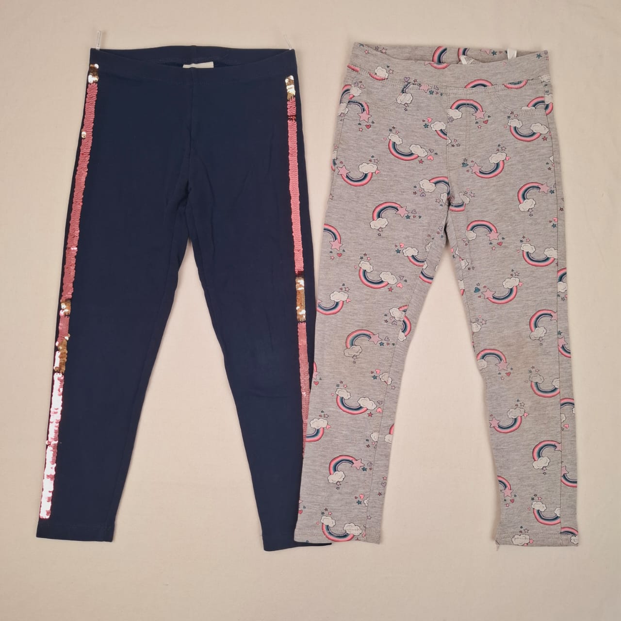 Autres commentaires : Lot de 2 Leggings, taille élastique: -Gris H&M à motifs arc-en-ciel, large taille élastique, 90% coton, 5% viscose, 5% élasthanne. -Bleu foncé C&A, une bande de paillettes roses sur les côtés, 95% coton, 5% élasthanne.