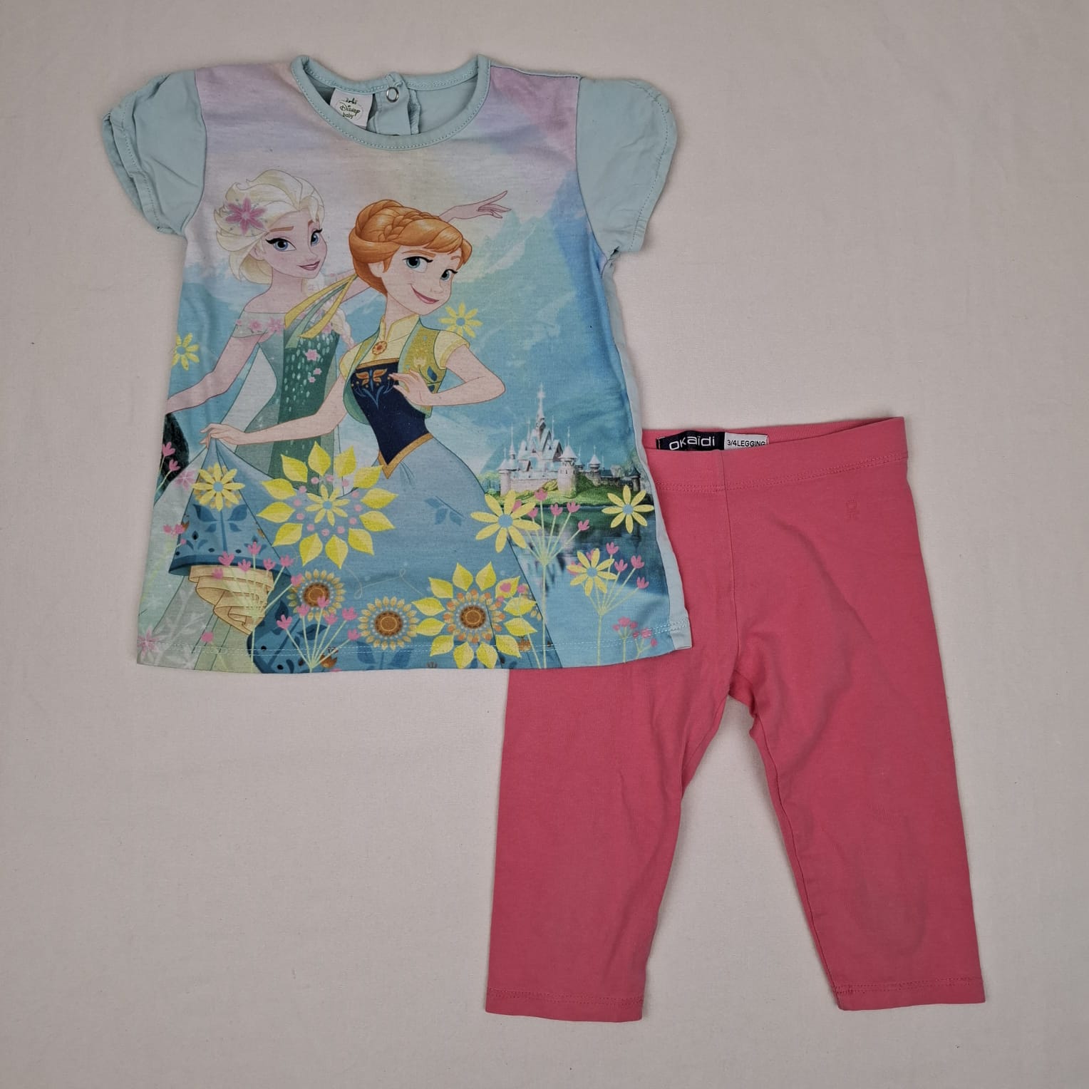 Autres commentaires : Leggings 3/4 rose uni Okaïdi, taille élastiquée. OFFERT T-shirt manches courtes vert d’eau, Disney Baby thème Reine des Neiges, fermeture par boutons pression en haut du dos.