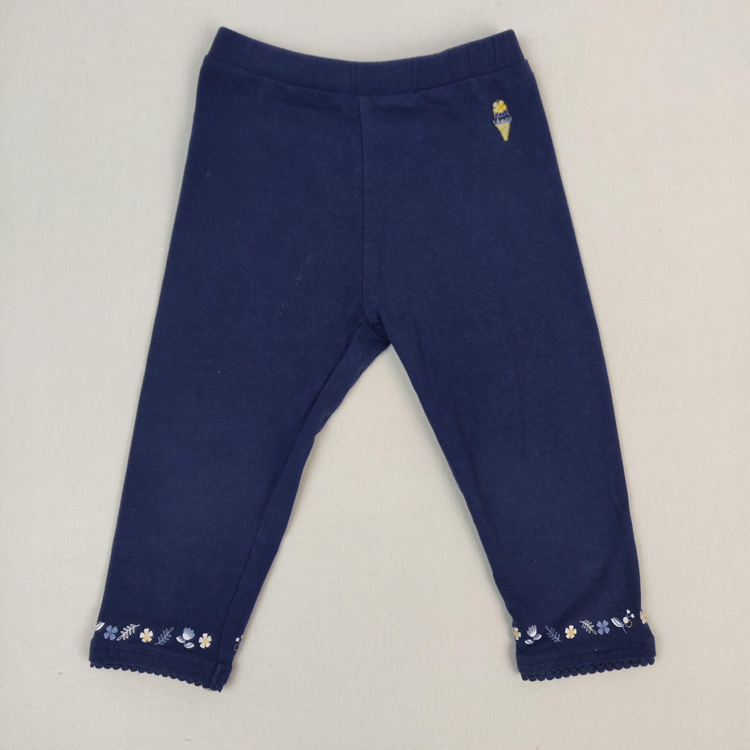 Autres commentaires : Leggings bleu foncé, motif fleur au niveau des chevilles et sur le côté en haut, taille élastique.