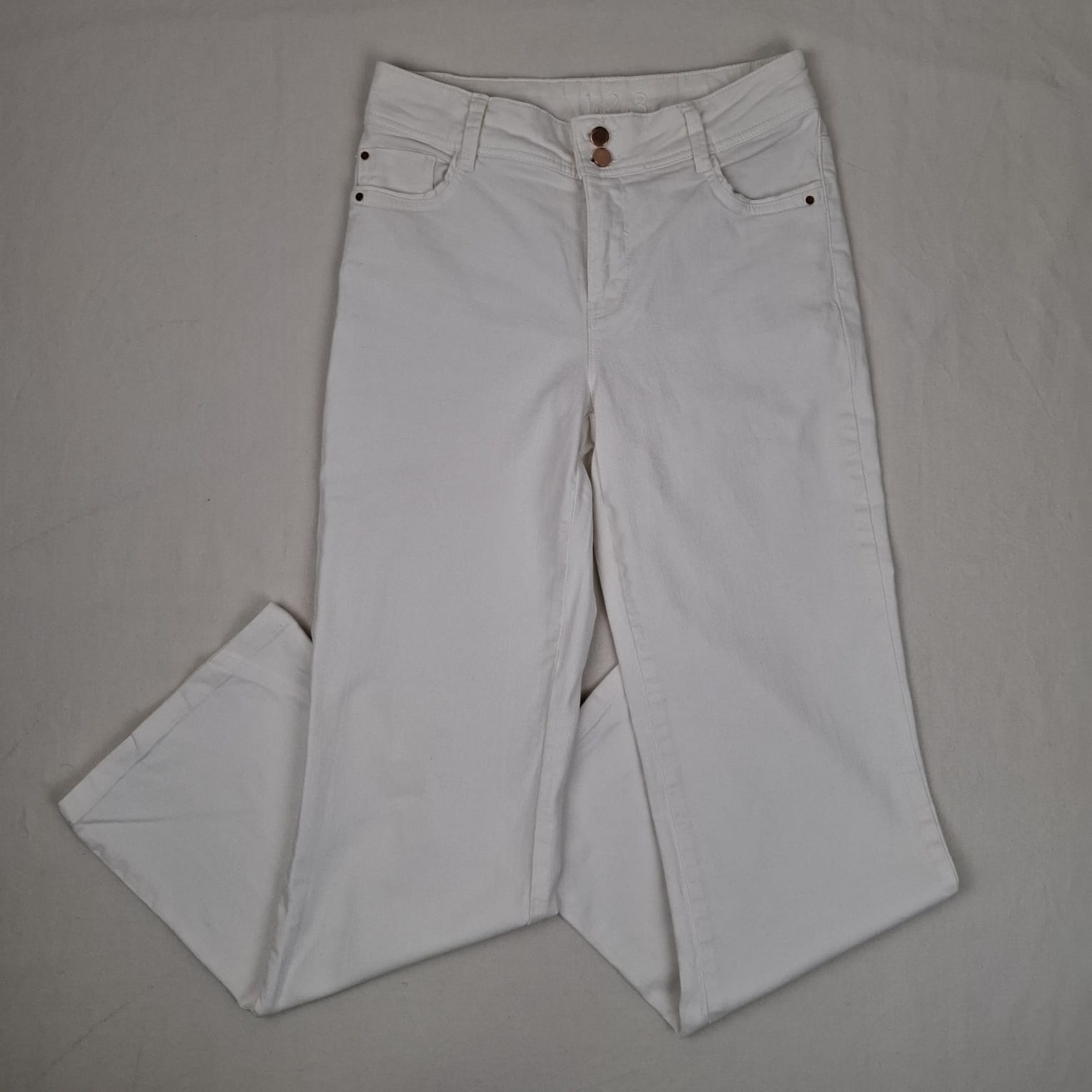 Autres commentaires : 3% élasthanne. Pantalon en toile blanche, coupe large et évasé en bas, fermeture devant par double boutons cuivrés et zip. Taille 36.