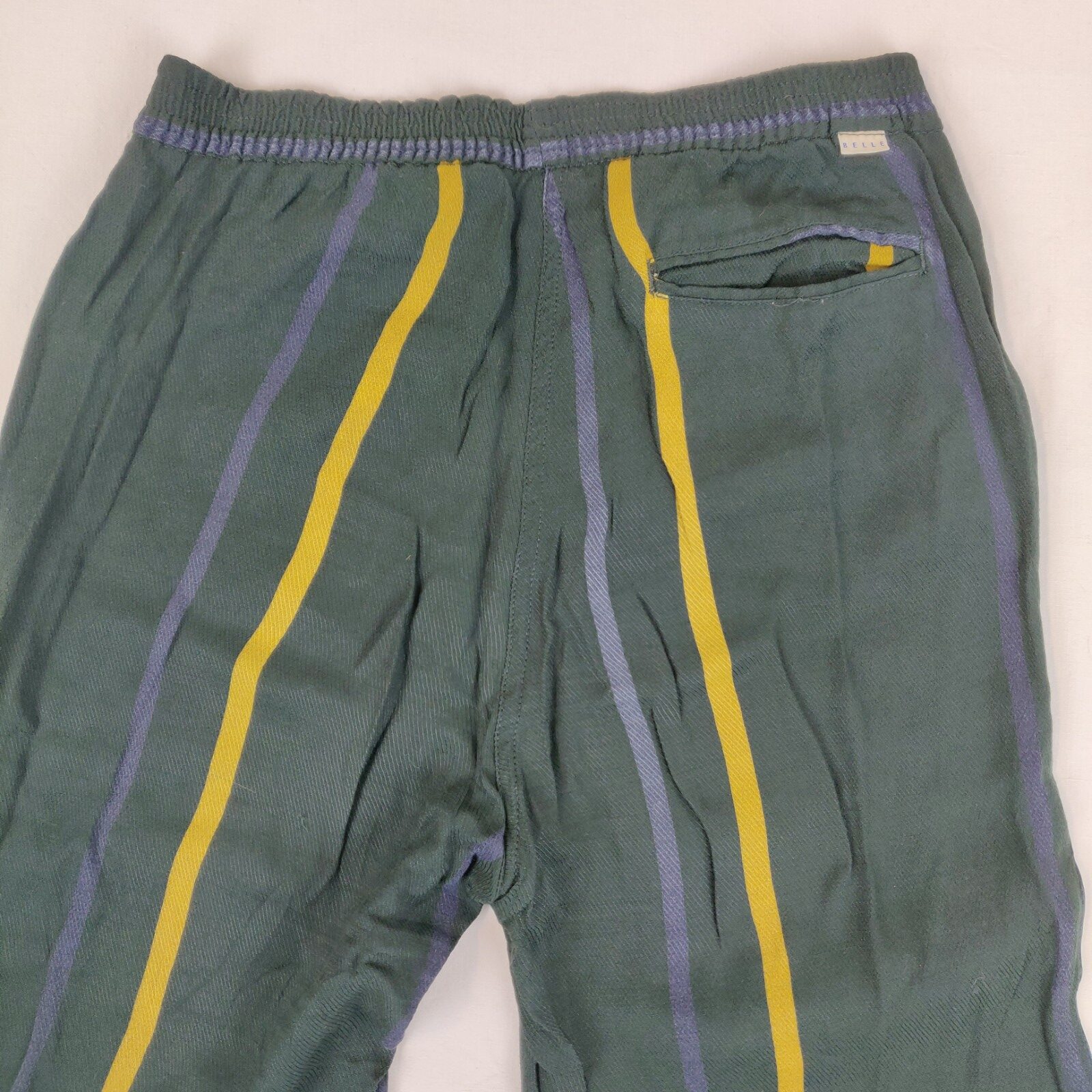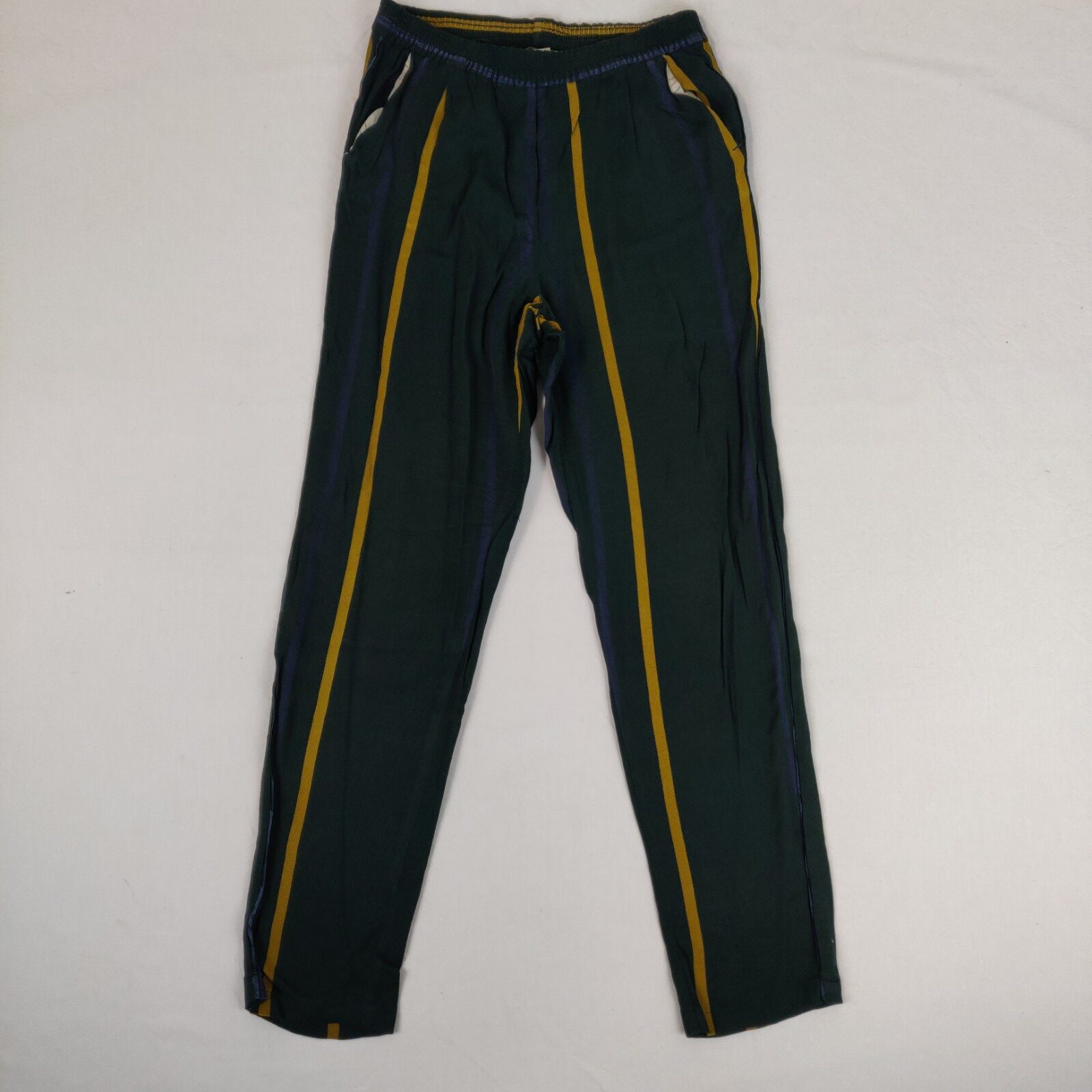 Autres commentaires : Pantalon vert avec quelques rayures verticale jaunes et bleus avec une taille élastiquée et 2 poches devant et une poche dérrière.Contient 55% de viscose et 45 d’acetate et pour la doublure 100 d’acetate.