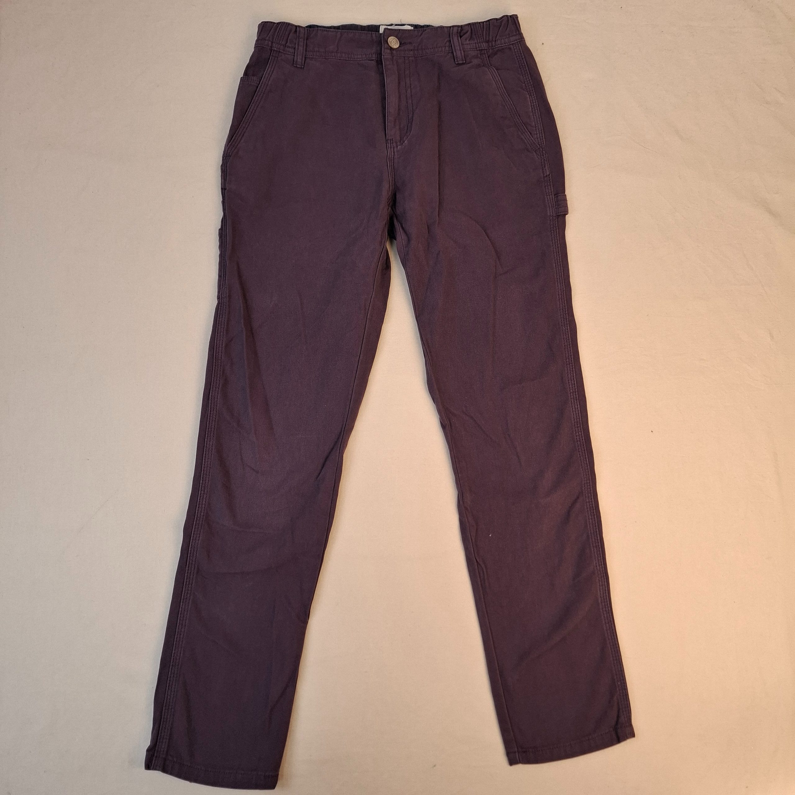 - Pantalon en toile violette, ceinture ajustable par élastique intérieur, fermeture par zip et bouton.