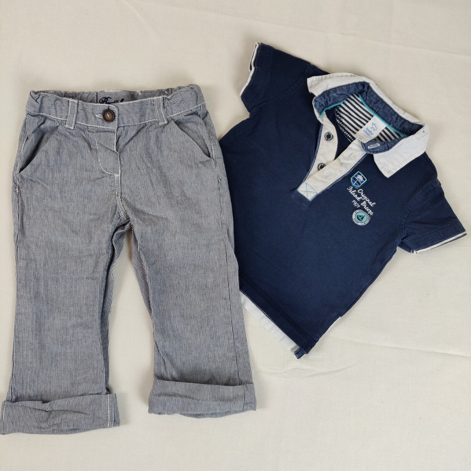 Autres commentaires : Pantalon rayé finement blanc et bleu. Taille ajustable. 2 poches latérales et 2 poches arrières en trompe-l’oeil. Chevilles retroussées. Un polo tâché C&A bleu marine offert.
