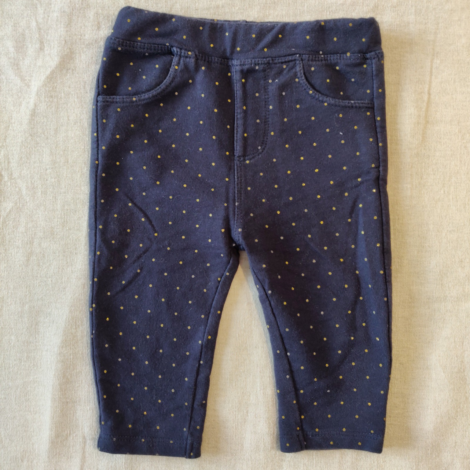 Autres commentaires : 6% Elasthanne. Pantalon bleu marine assez léger à pois dorés. Taille élastiquée.