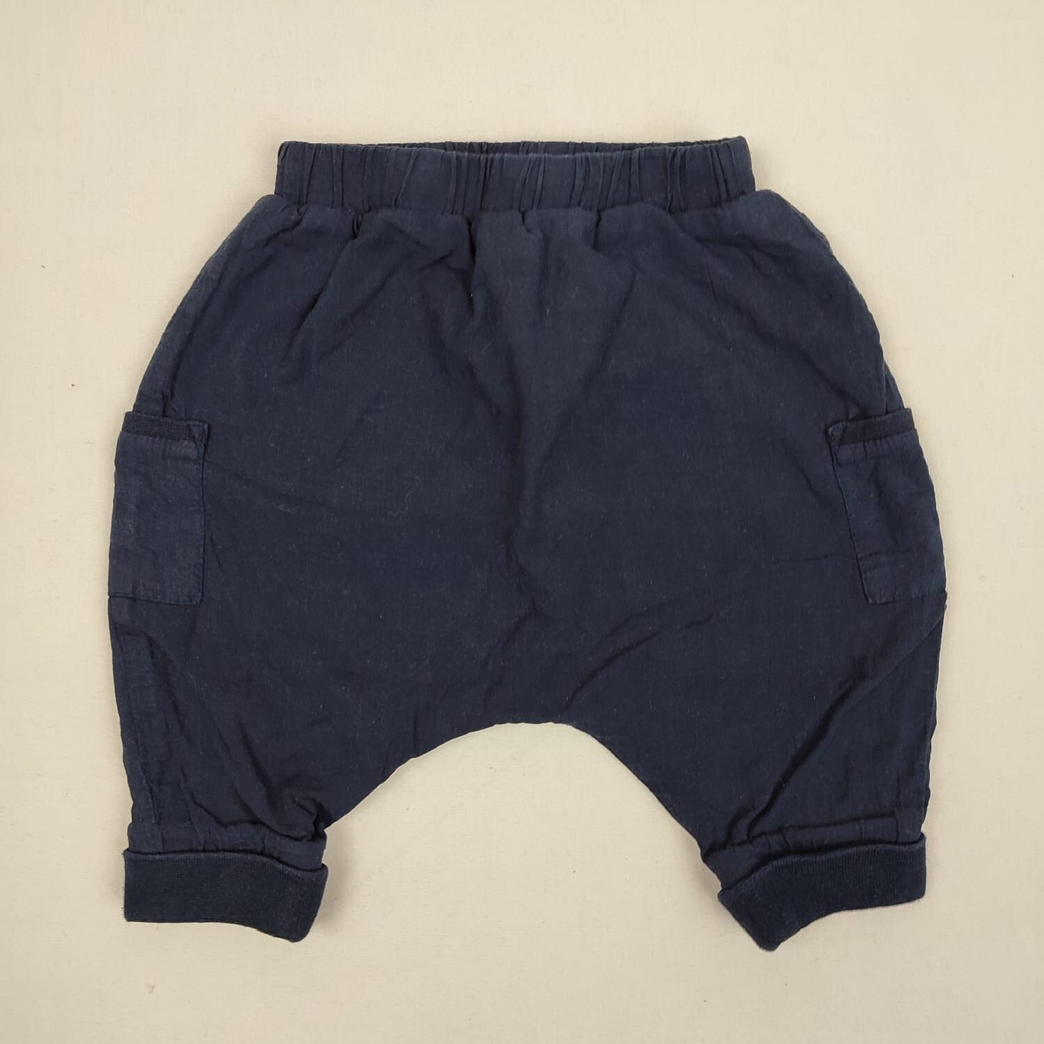 Autres commentaires : 3% élasthanne. Pantalon bleu nuit de style sarrouel, doublure en jersey, taille élastiquée.
