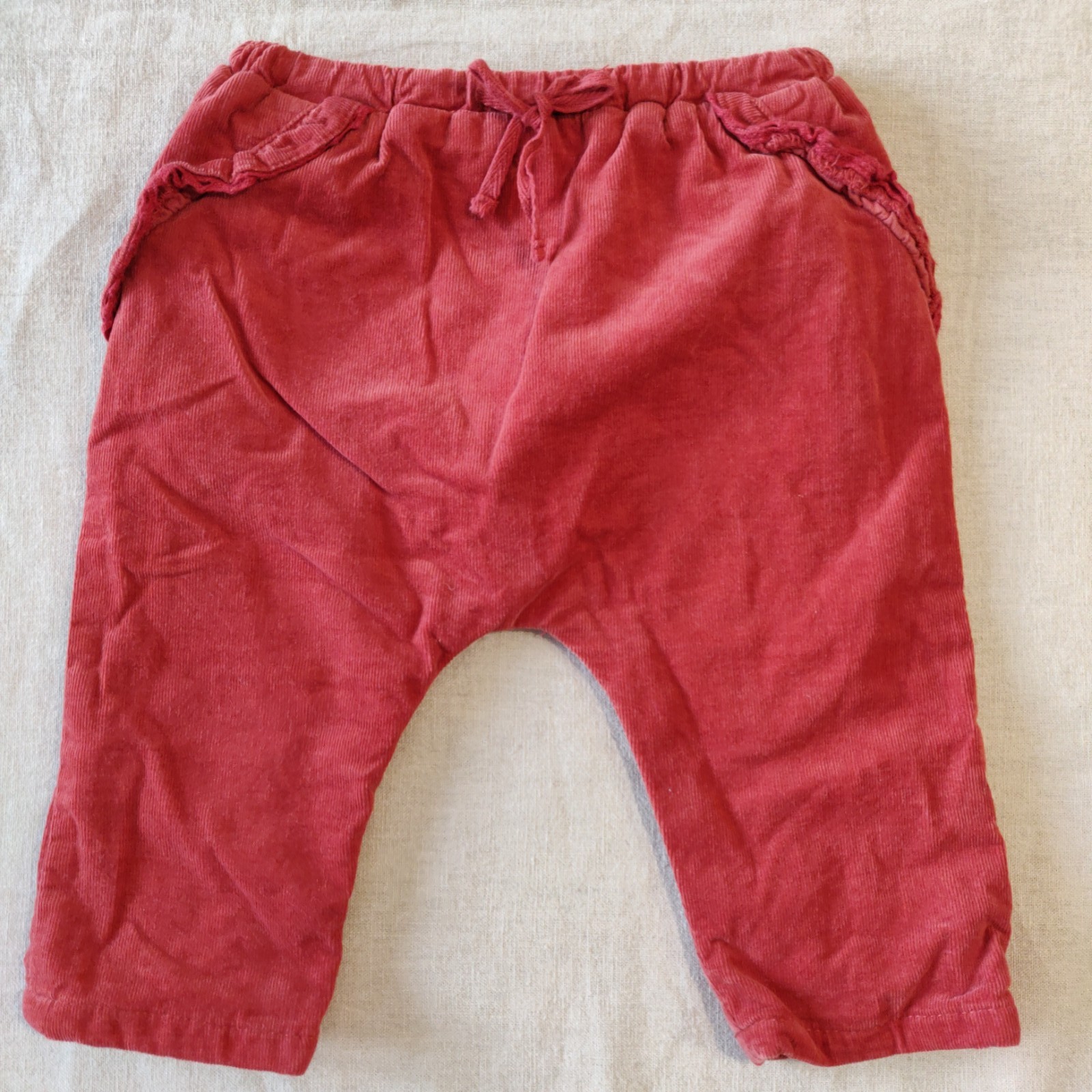 Autres commentaires : Extérieur 2% élasthanne. Pantalon en velours finement côtelé couleur rouille, doublé en coton. 2 fausses poches à volants et dentelles. Taille élastiquée ajustable par cordons.