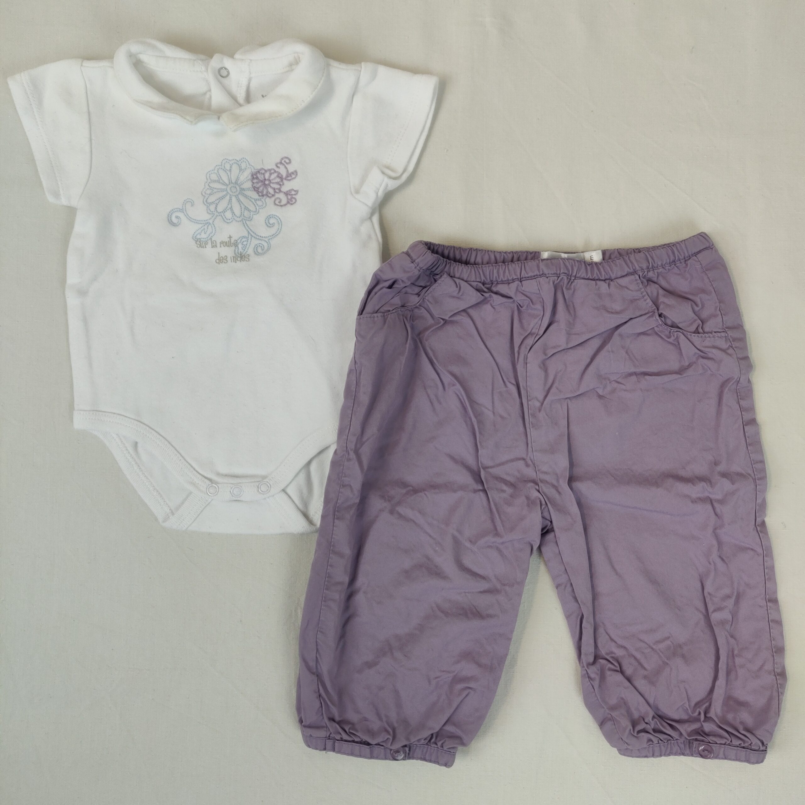 Autres commentaires : Pantalon finement doublé – parme. Taille élastique. 2 poches latérales en trompe-l’oeil. Un body à manches courtes blanc Verbaudet offert avec une tâche marron au niveau du col.