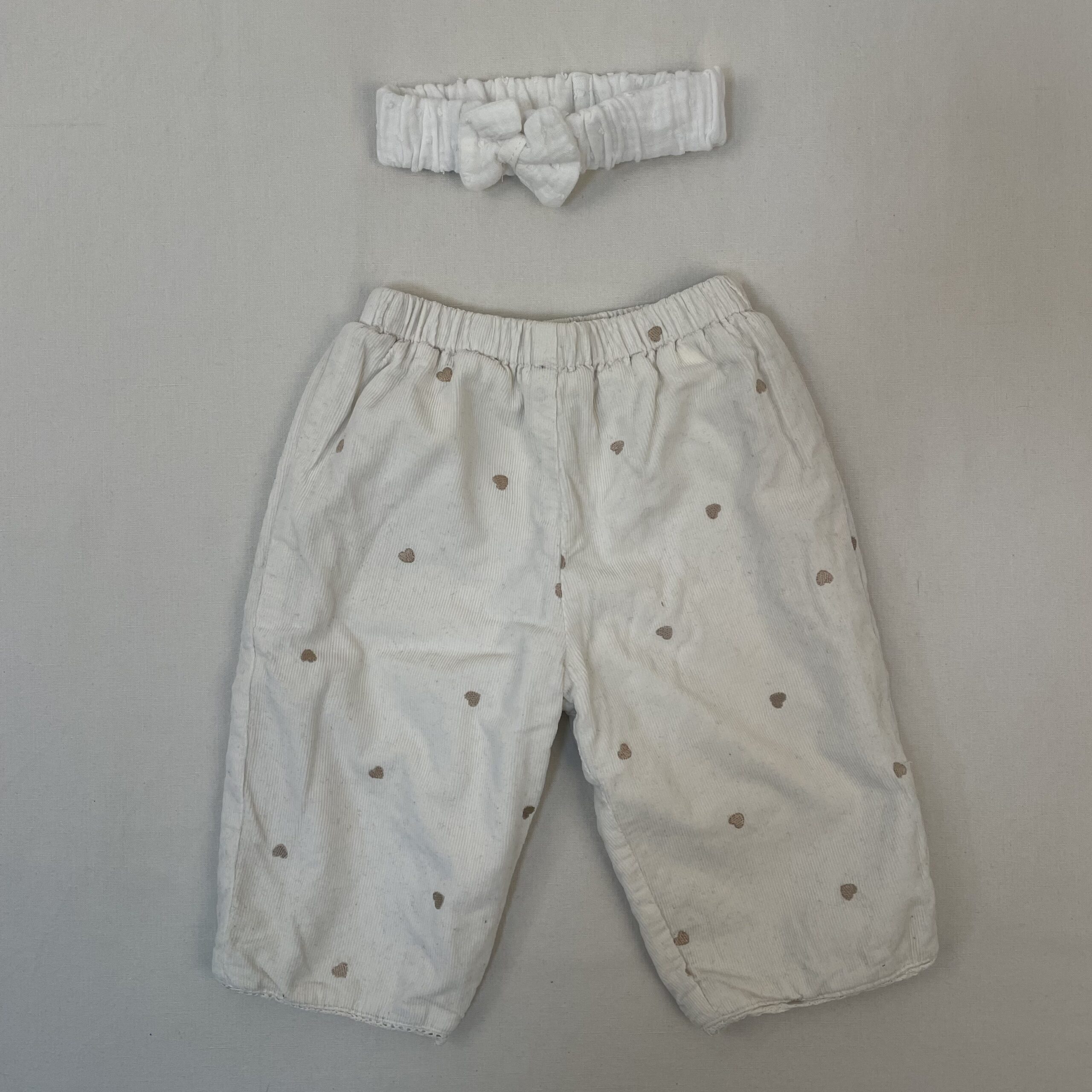 • Pantalon en velours côtelé blanc cassé, parsemé de mini coeurs beiges, taille élastiquée, doublure en jersey de coton blanc cassé. Bandeau pour les cheveux élastiqués blanc cassé parsemé de points en relief ton sur ton, noeud décoratif.