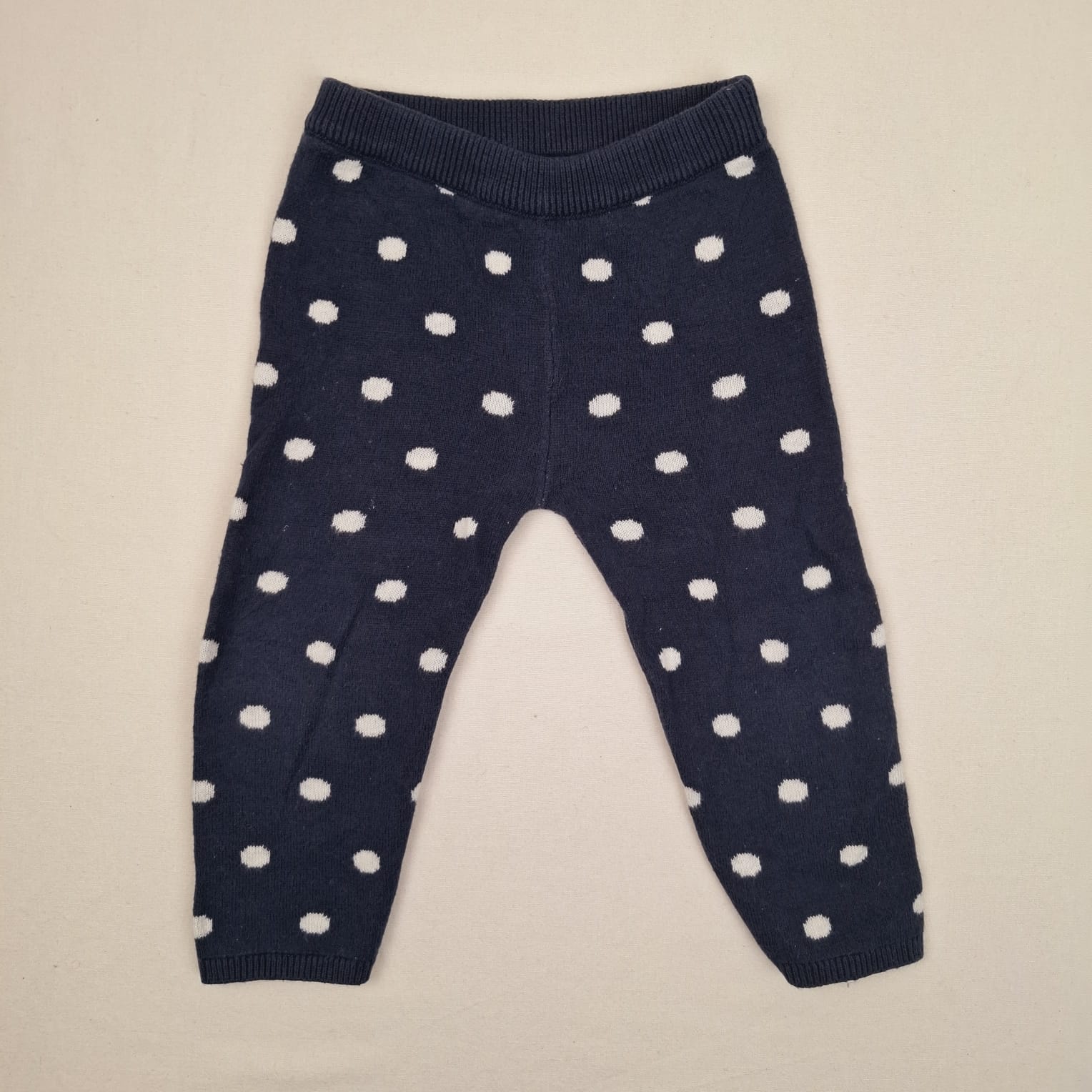 Autres commentaires : Pantalon épais bleu foncé, 9 mois, bout’chou , motifs points blancs sur tout le vêtement, 15% laine.