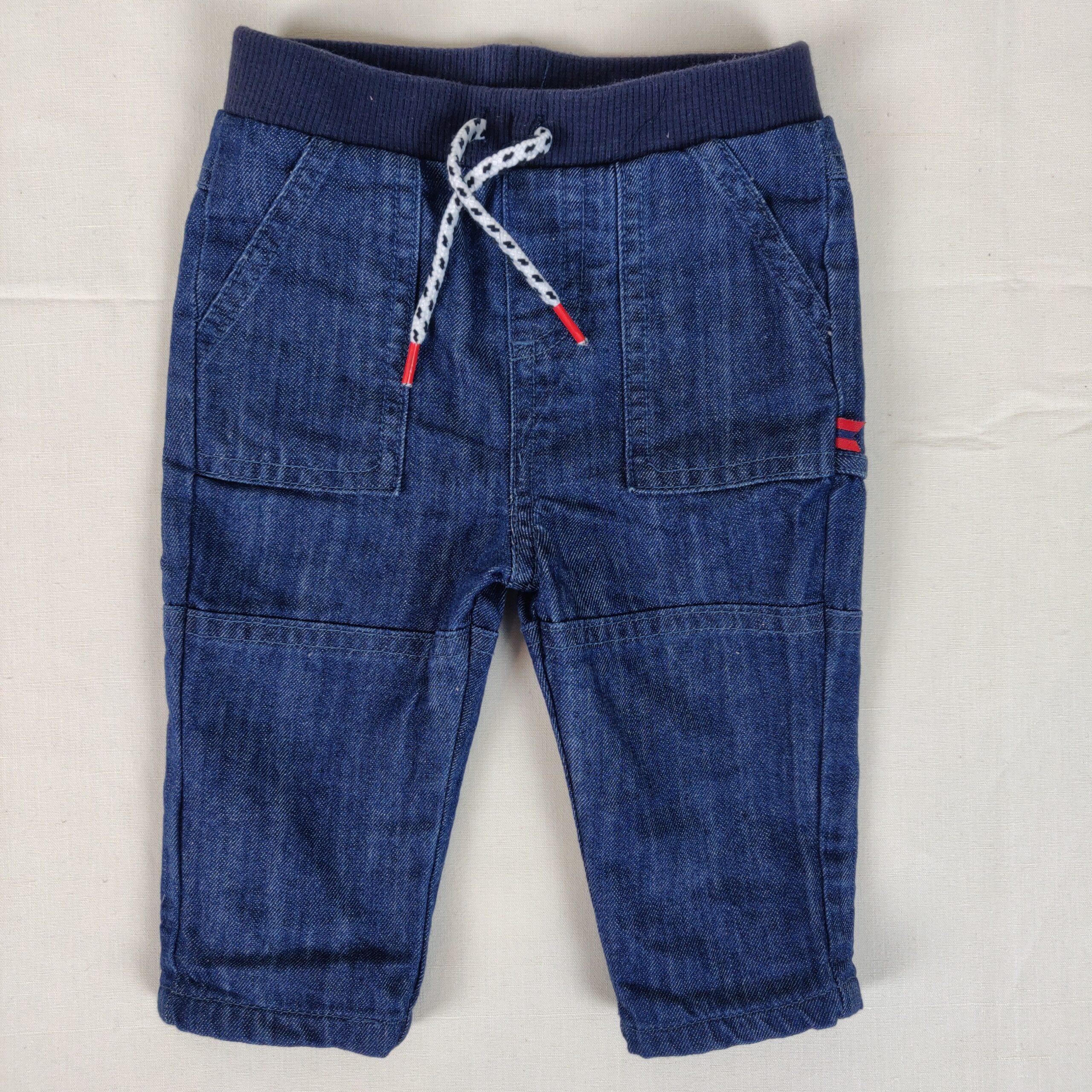 Autres commentaires : Pantalon bleu denim à empiècements. Deux poches cotés et deux arrières. Taille élastique et cordon décoratif.