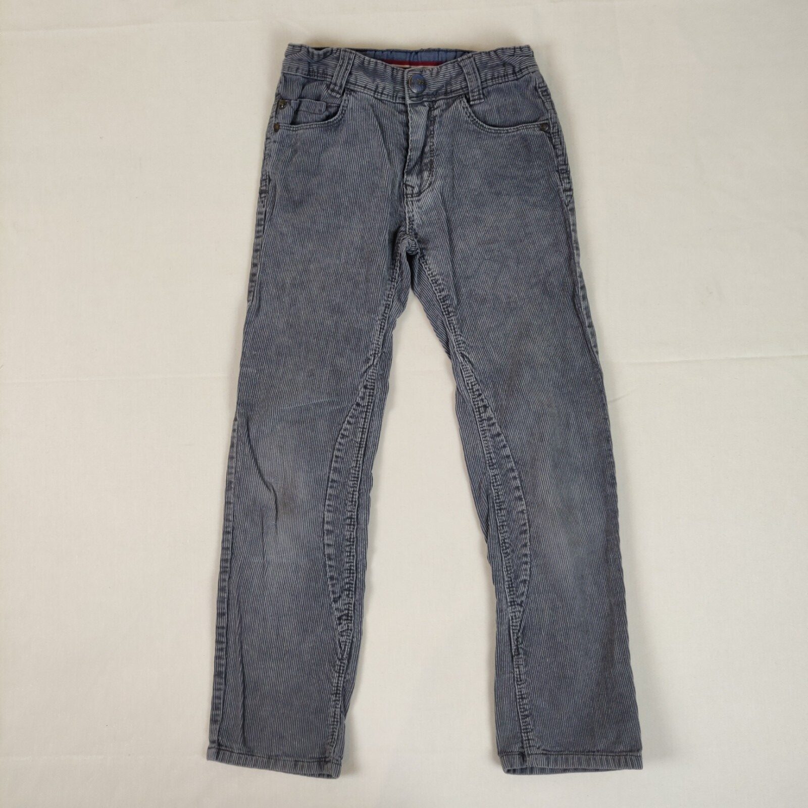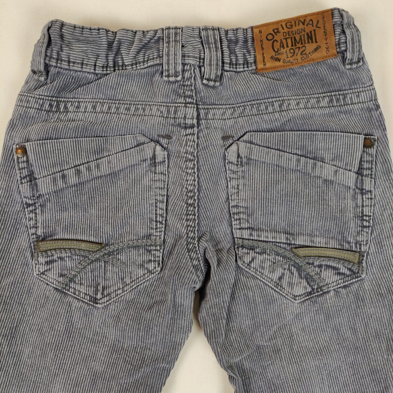Autres commentaires : 2% polyester. Pantalon en velour cotelé gris. Taille ajustable. Ouverture centrale à zip et crochet. 2 poches latérales et 2 poches arrières. Griffe marron de la marque à la taille arrière.