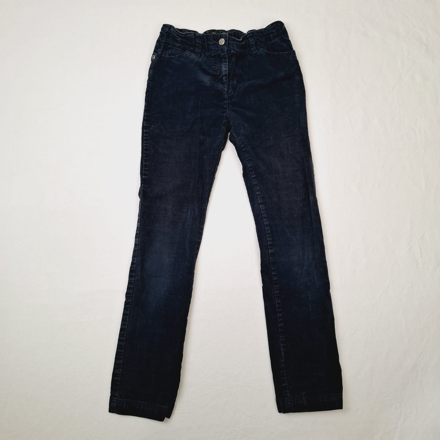 Autres commentaires : 2% élasthanne. Pantalon en velours finement côtelé bleu nuit, slim fit, ceinture ajustable par élastique intérieur, fermeture devant par zip et par crochet métallique.