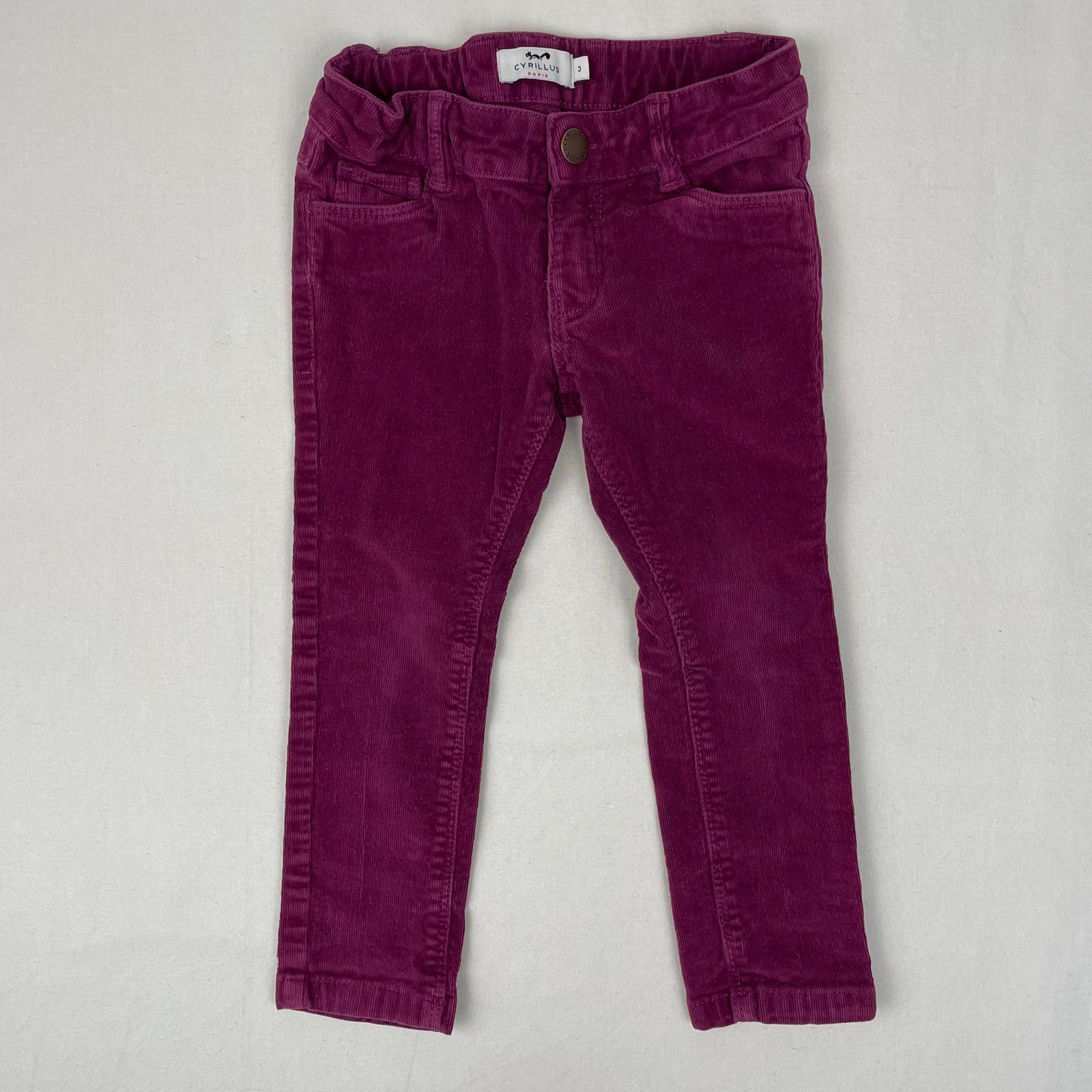 Autres commentaires : Pantalon violet en velours cotelé, bouton pression à la braguette. 2% élasthane.
