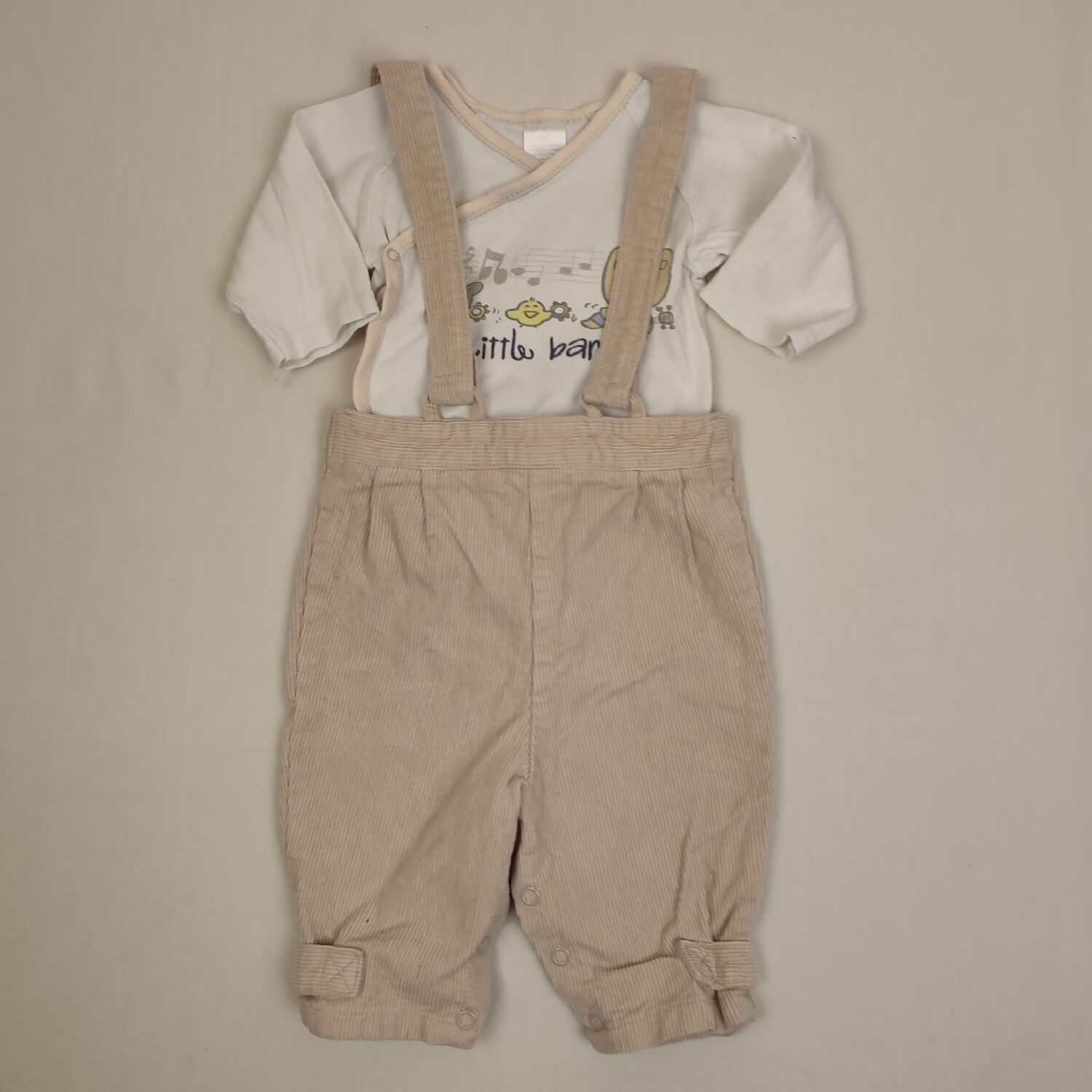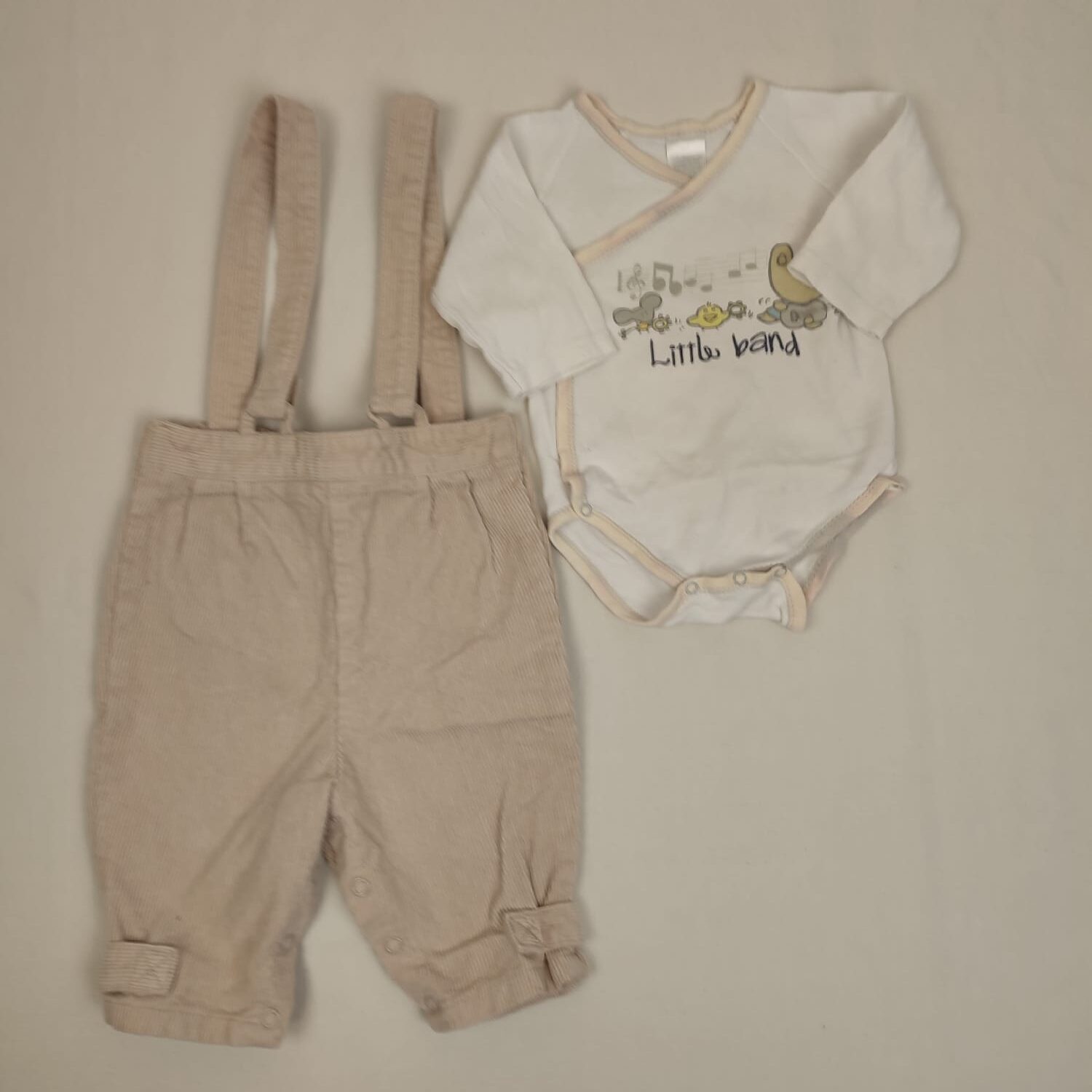 Autres commentaires : Pantalon beige en velours côtelé, bas des jambes et bretelles réglables par scratch, taille élastiquée, fermeture par boutons pression à l’entrejambe. OFFERT : body croisé à manches longues blanc à liseré beige, sans marque, motif animaux musiciens avec inscription LITTLE BAND sur le devant.