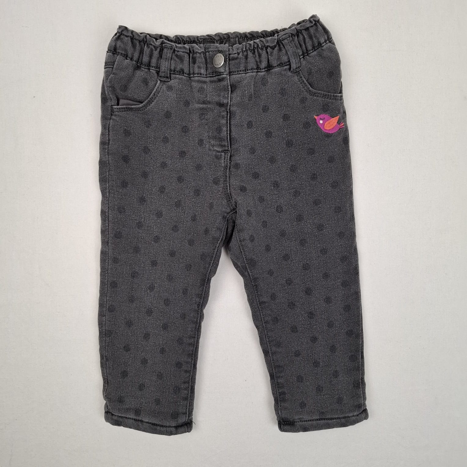 Autres commentaires : Pantalon en jean gris à pois gris foncé, fermeture par bouton pression, ceinture ajustable par élastique intérieur, doublure polaire.