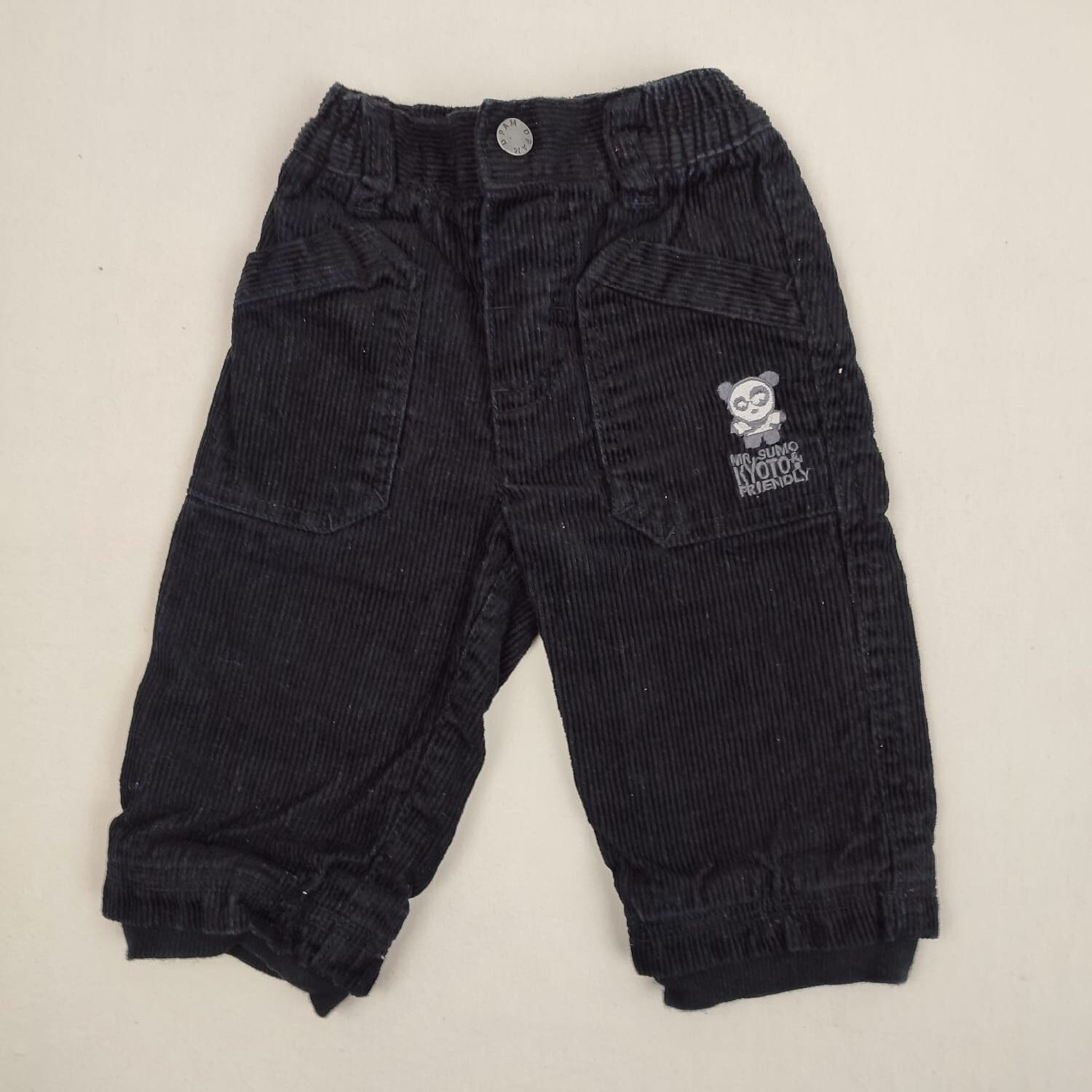 Autres commentaires : Pantalon en velours noir côtelé, motif mini panda avec inscription « Mr SUMO KYOTO FRIENDLY », doublure en coton 100%, ceinture ajustable par élastique intérieur, fermeture devant par bouton pression.