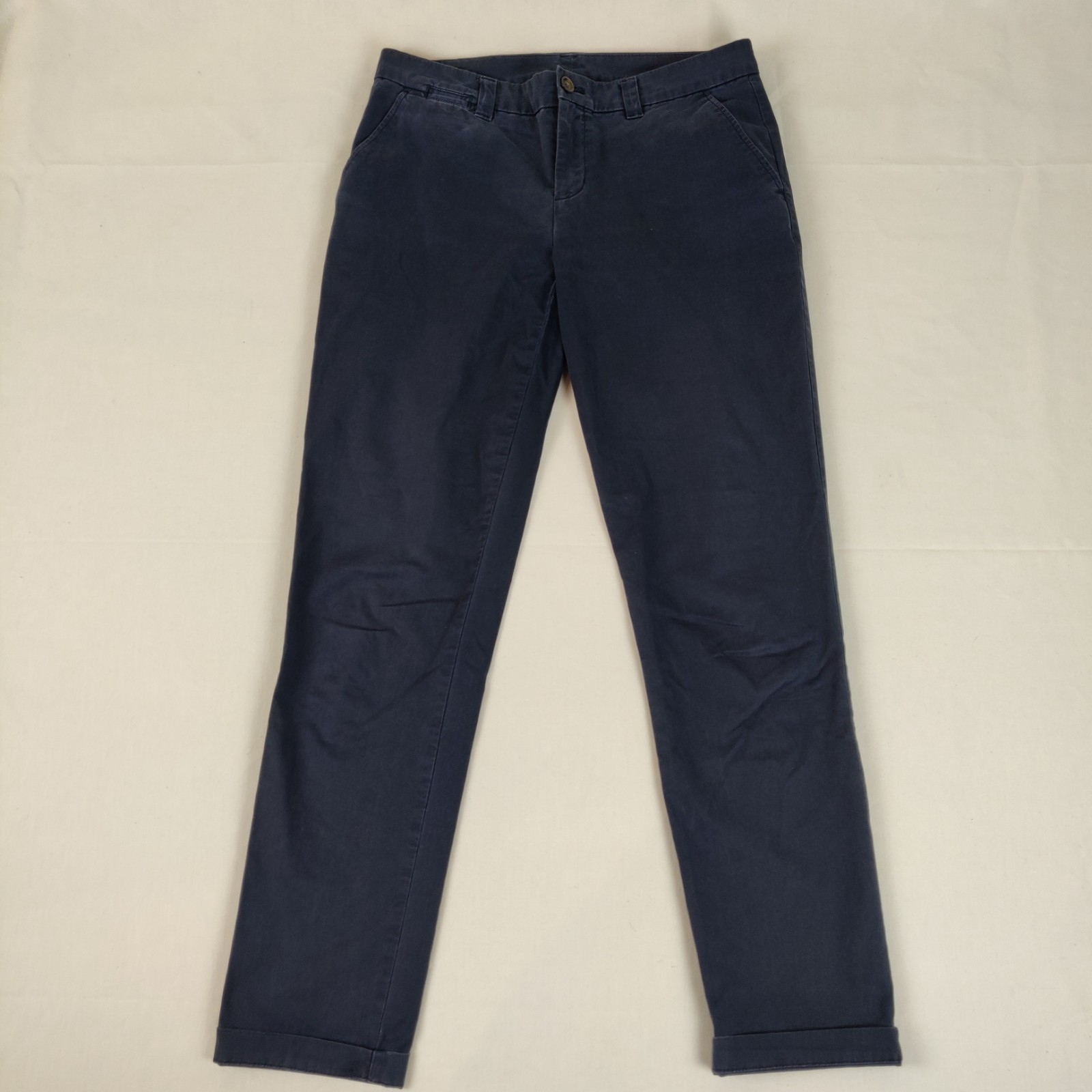 Autres commentaires : 2% élasthanne. Pantalon chino (taille US 2) – bleu. Ouverture centrale à fermeture éclair et bouton classique. 2 poches latérales et 2 poches arrières. Chevilles retroussées. Passants pour une ceinture. Usure normale du vêtement.